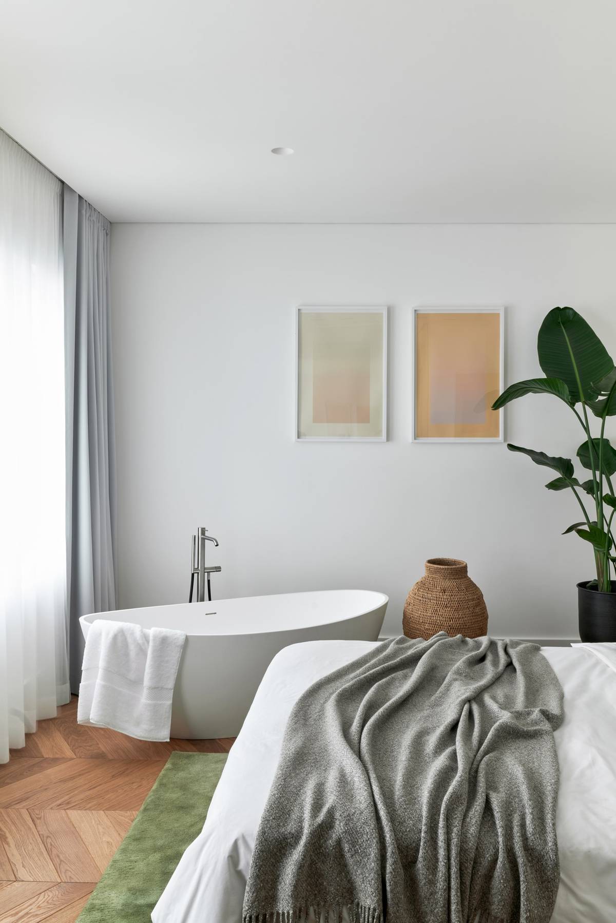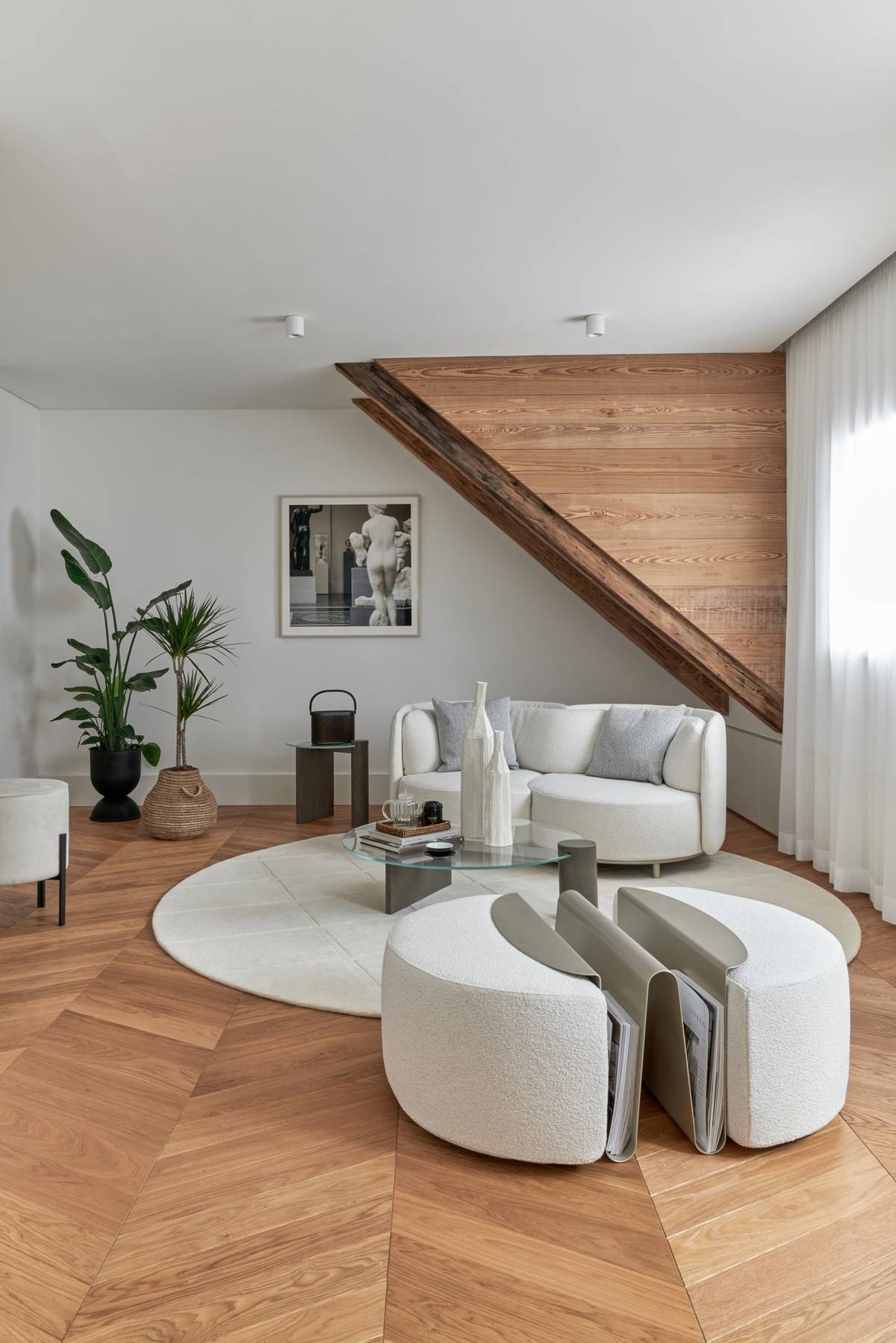 Pohovky jsou uspořádány tak, aby byl interiér vizuálně v rovnováze