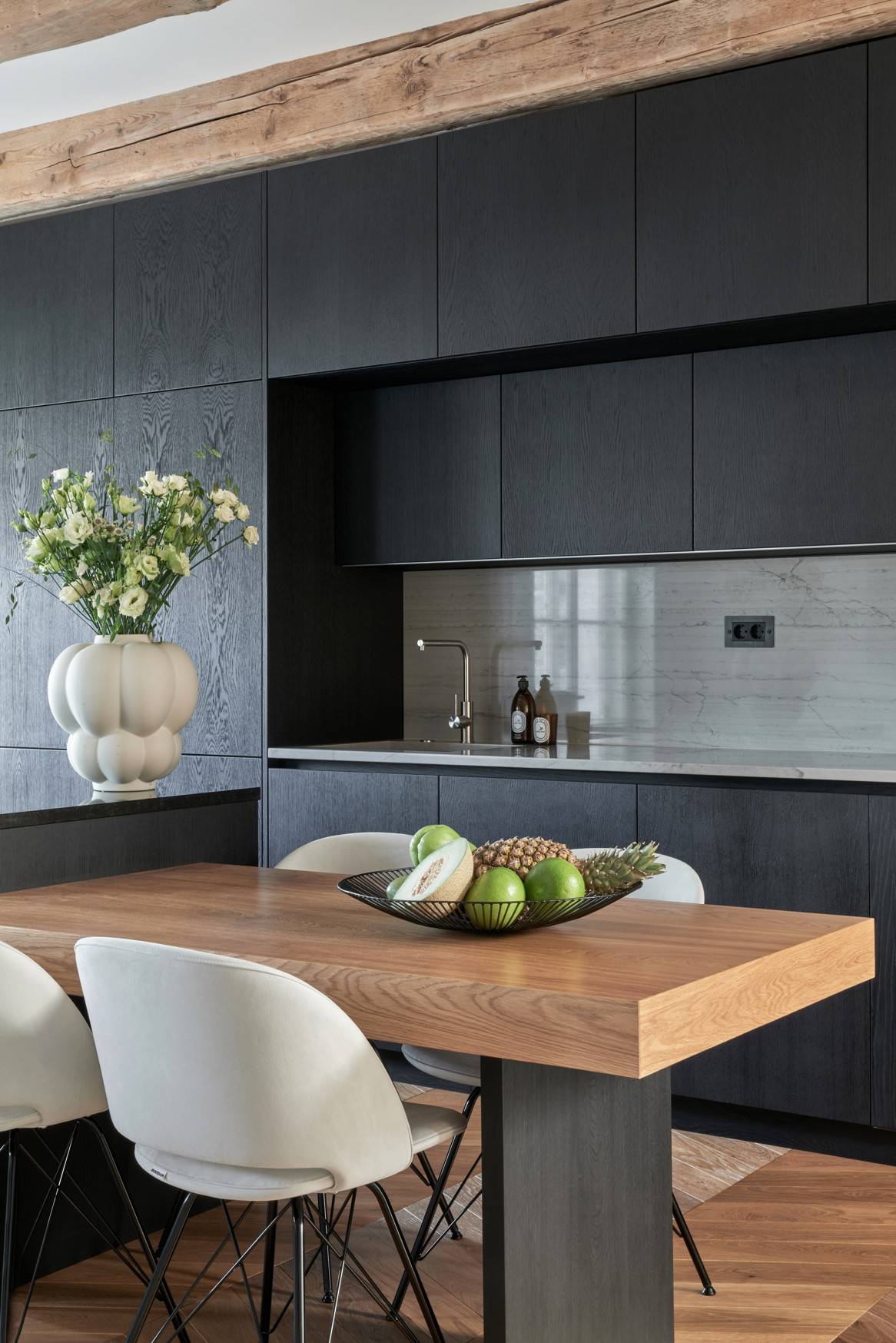 Původně byly trámy pod rákosovým stropem. Autor je nechal obnažit a očistit…
