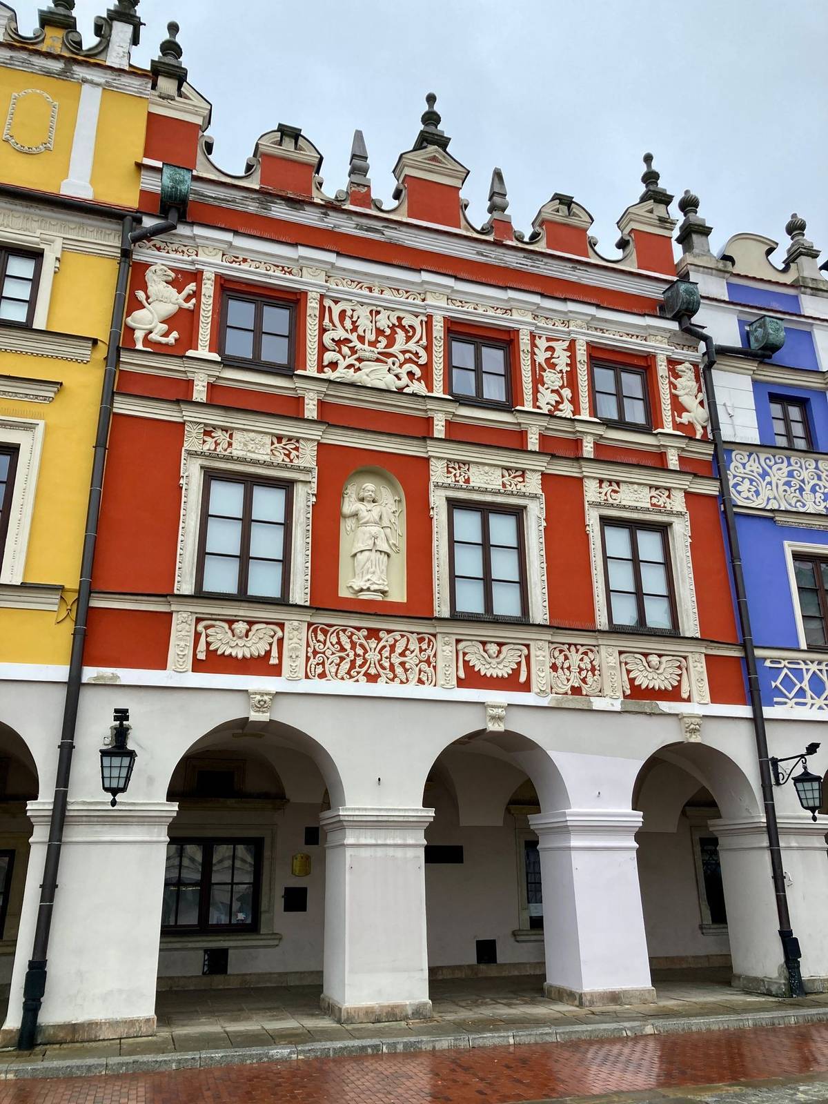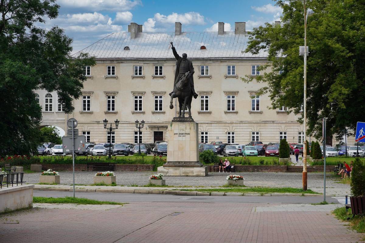 Socha Jana Zamojského na koni. V pozadí je jeho palác.