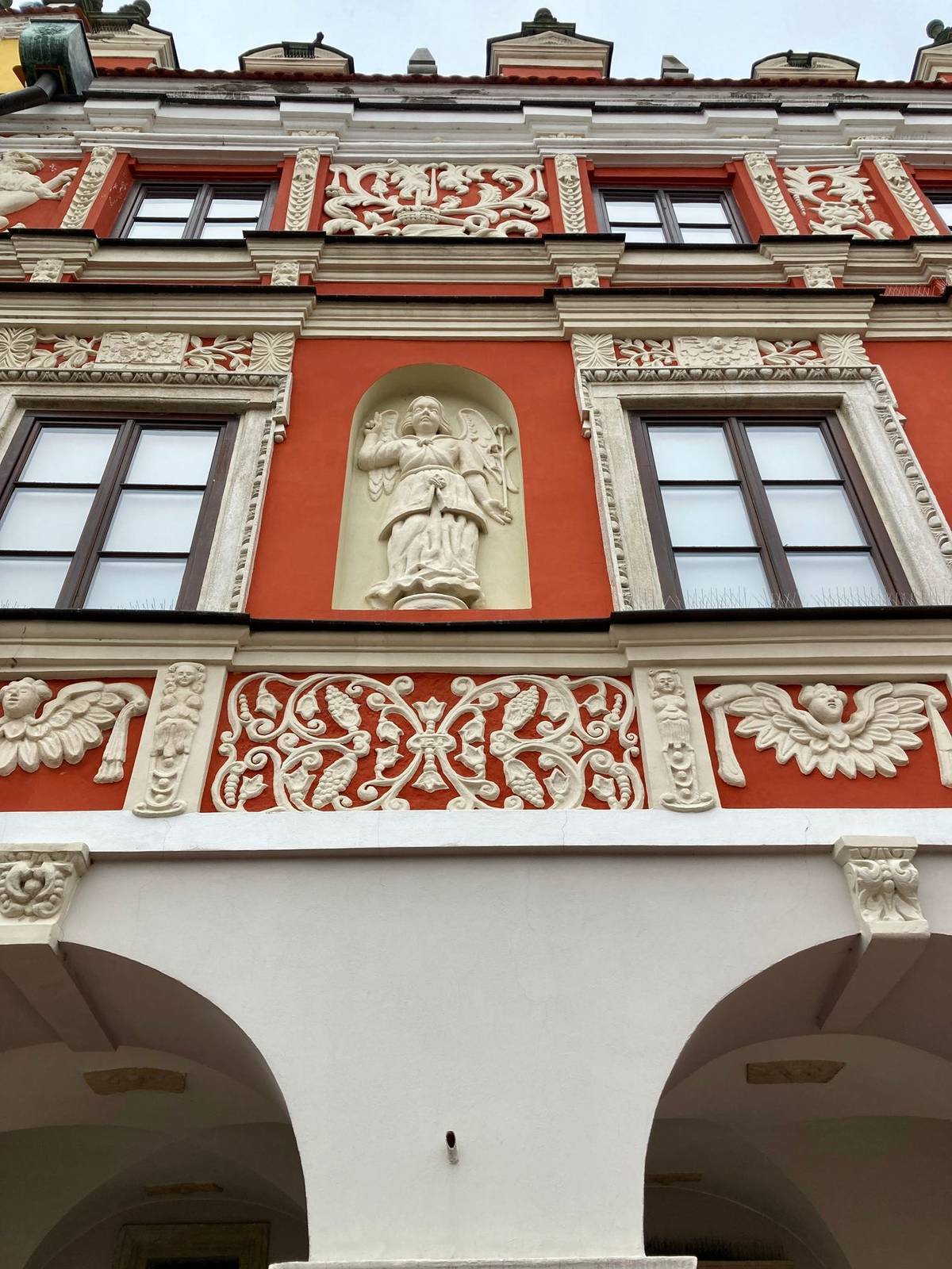 Červený dům, nejvýrazněji zbarvený a nejbohatěji zdobený, nese nápadný reliéf archanděla Gabriela,...