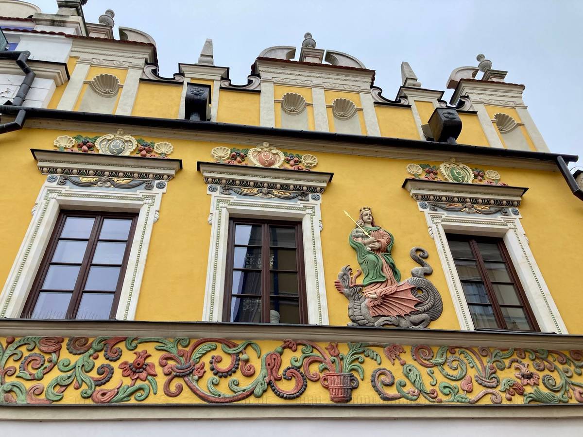Bohatě zdobený Dům pod madonou, dostal jméno podle reliéfu madony, která drží dítě a stojí na drakovi – symbolu zla.