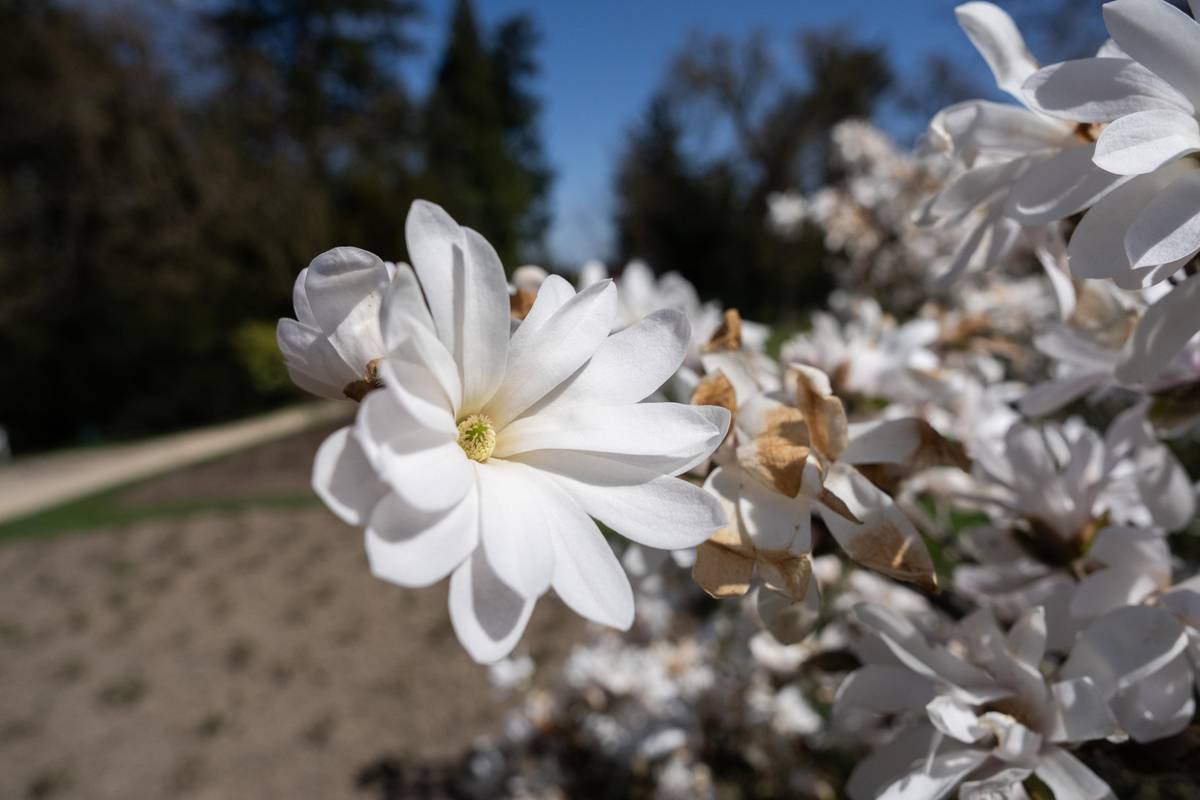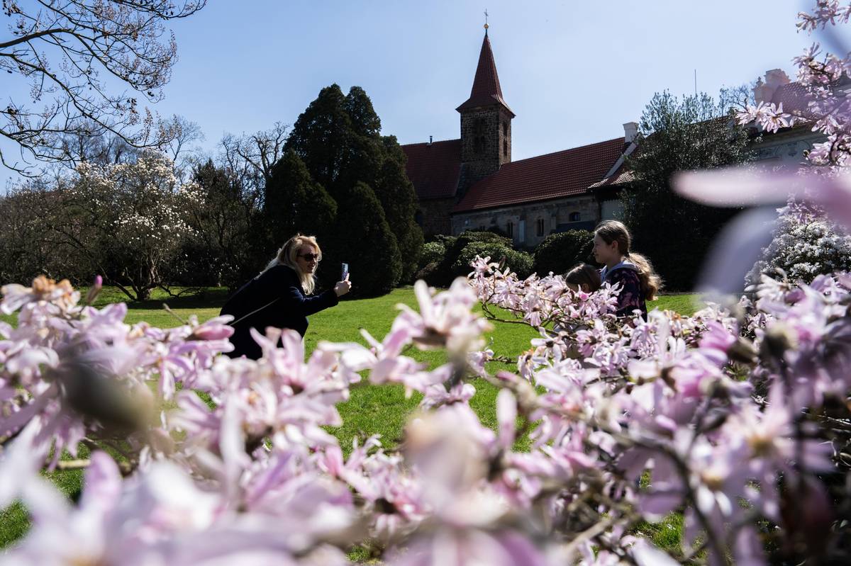 Šácholan hvězdovitý, kterému se též říká magnólie hvězdovitá, je u hlavního vstupu do Průhonického parku vděčnou kulisou pro fotografie návštěvníků.