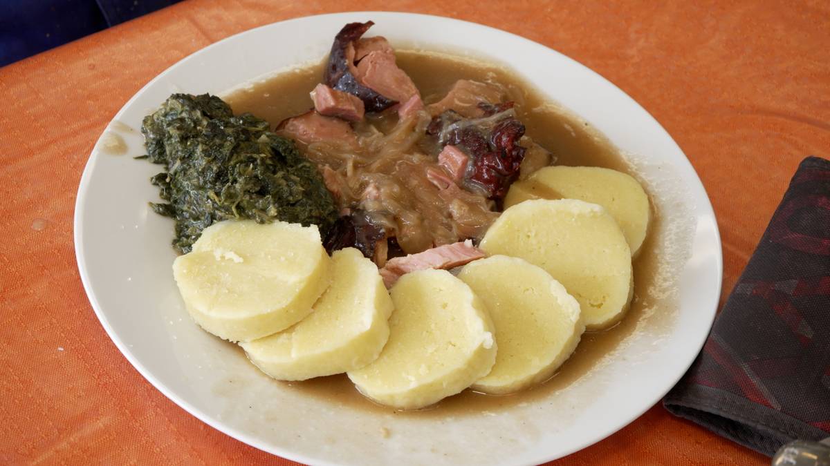 Uzená krkovice se špenátem a knedlíky