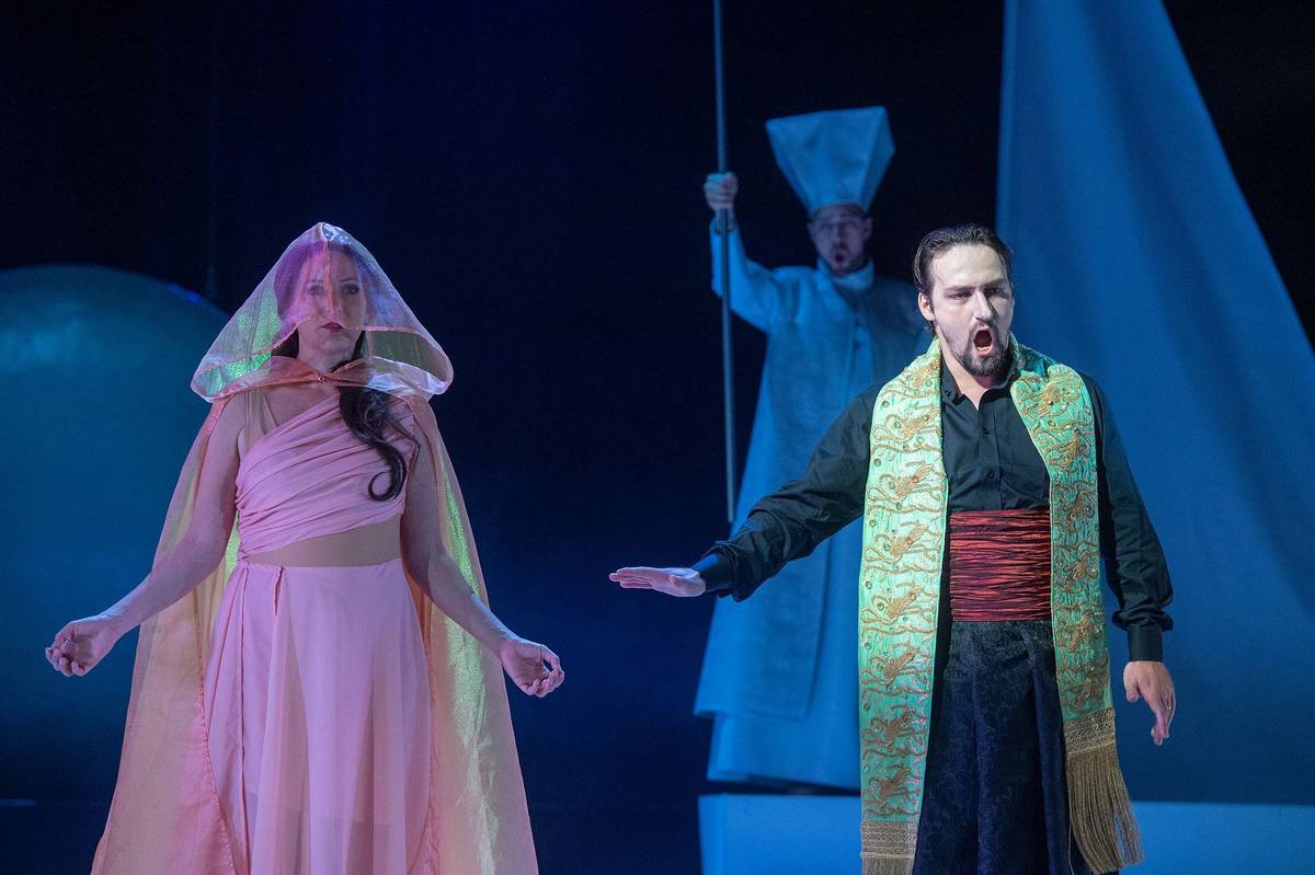 Lívia Obručník Vénosová jako Leila a Jan Hnyk jako Nourabad na zkoušce Lovců perel.