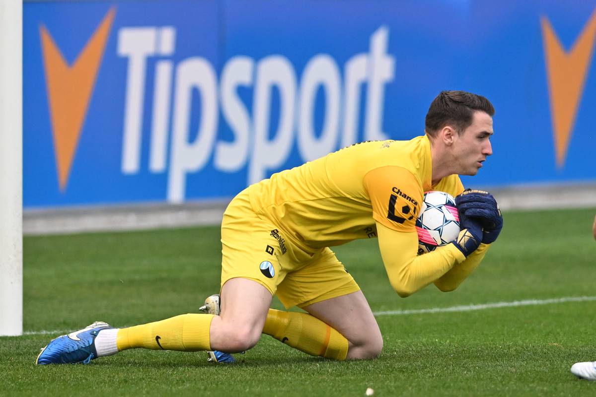 Liberecký gólman Ivan Krajčírik kryje míč ve své náruči.