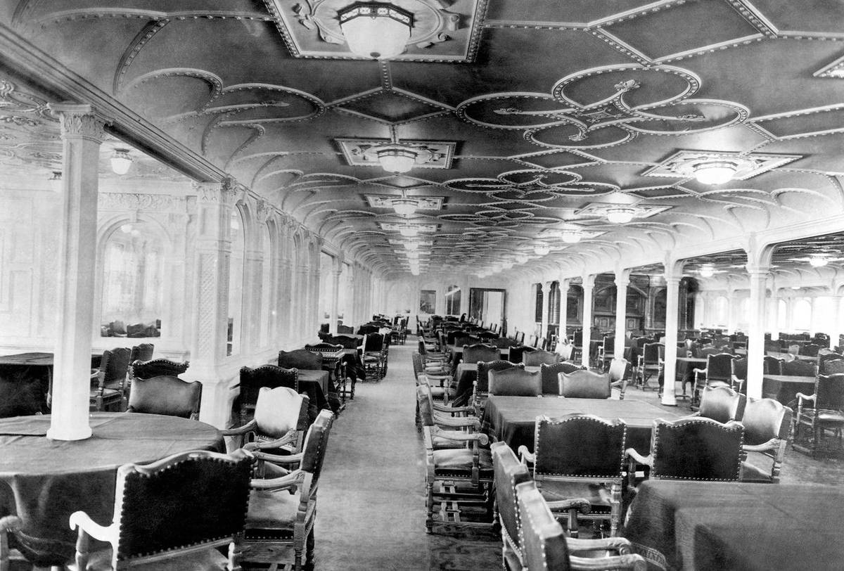 Tato fotografie zachycuje hlavní jídelnu první třídy na Titaniku, umístěnou na palubě D. Byla největší svého druhu na moři – prostorná, luxusně vybavená, navržená v edwardiánském stylu a osvětlovaná tehdy moderními elektrickými svítidly.