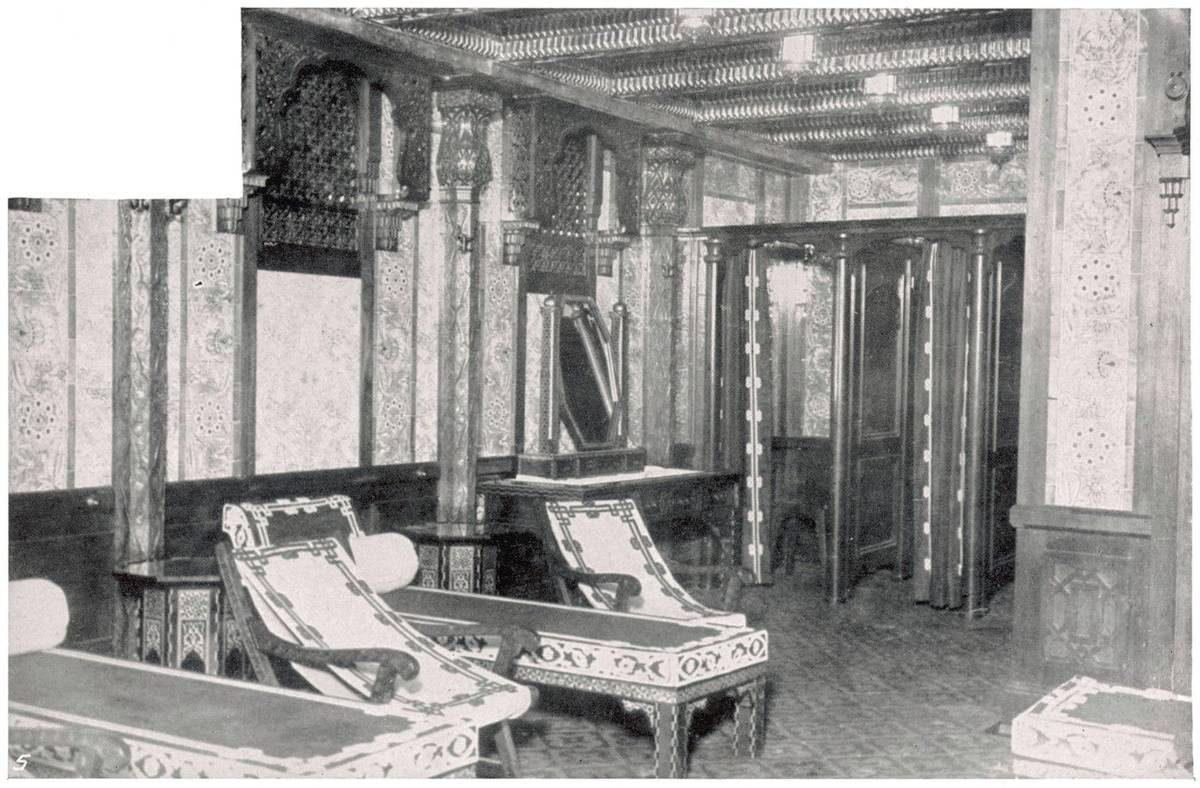Fotografie zachycuje jednu z nejexotičtějších částí Titaniku – odpočívárnu tureckých lázní, určenou výhradně pro pasažéry první třídy. Prostor byl vyzdoben v orientálním stylu s dekorativními mozaikami, dřevěnými vyřezávanými prvky a lehátky připomínajícími luxusní salonky. Lázně byly symbolem do té doby nevídaných možností luxusu a pohodlí na moři.