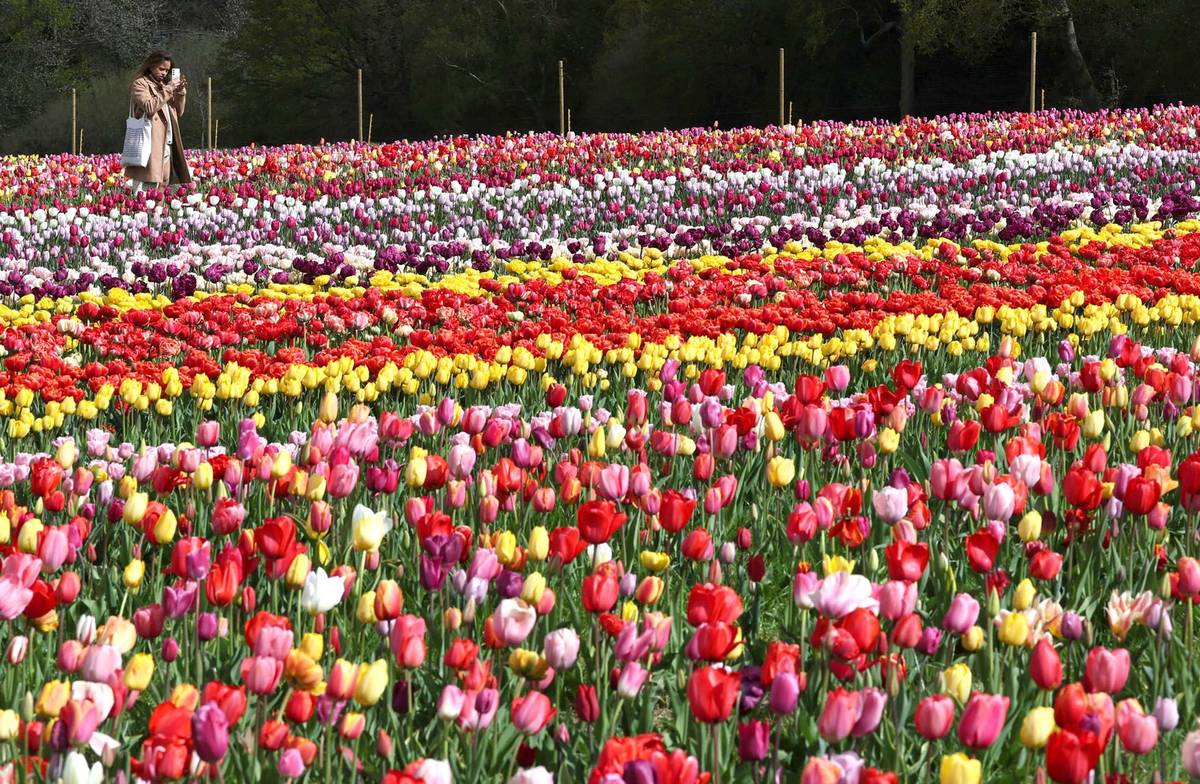 Návštěvníci se procházejí mezi rozkvetlými tulipány. V barevných polích na farmě Tulleys vykvetlo na jeden a půl milionu cibulek. Jaro v Sussexu tu hraje všemi odstíny.