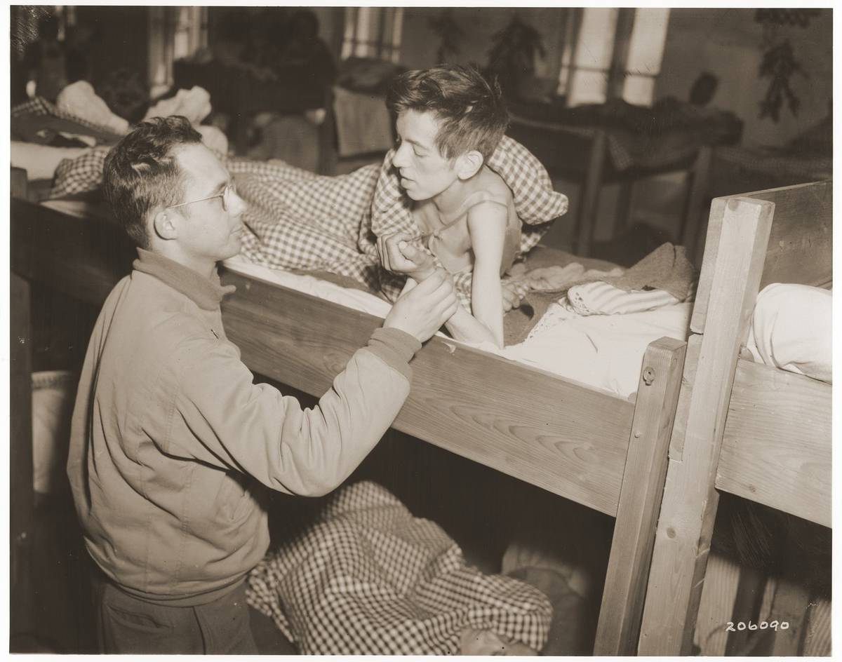 Vojenský lékař poskytuje pomoc bývalým vězňům propuštěným z koncentračních táborů na území Československa.