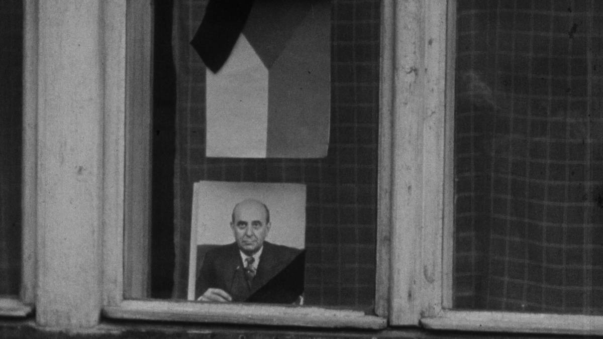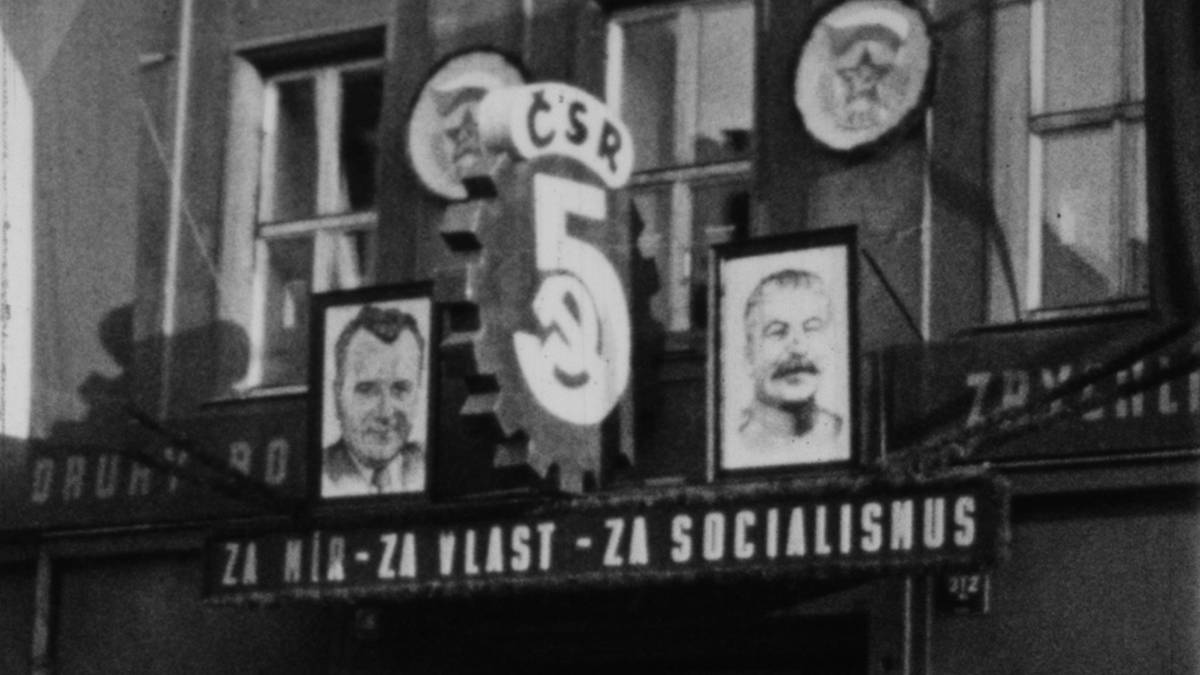 Přiostřuje se, záběry z let 1948–1950. V okně fotka Jana Masaryka, který dlouho věřil, že se s komunisty dá dohodnout…