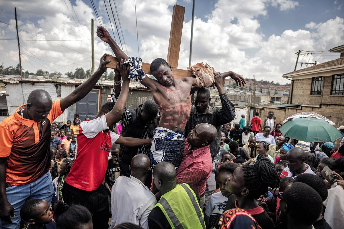Křesťanští věřící během rekonstrukce Umučení Krista v neformální osadě Kibera v keňském Nairobi, 18. dubna.
