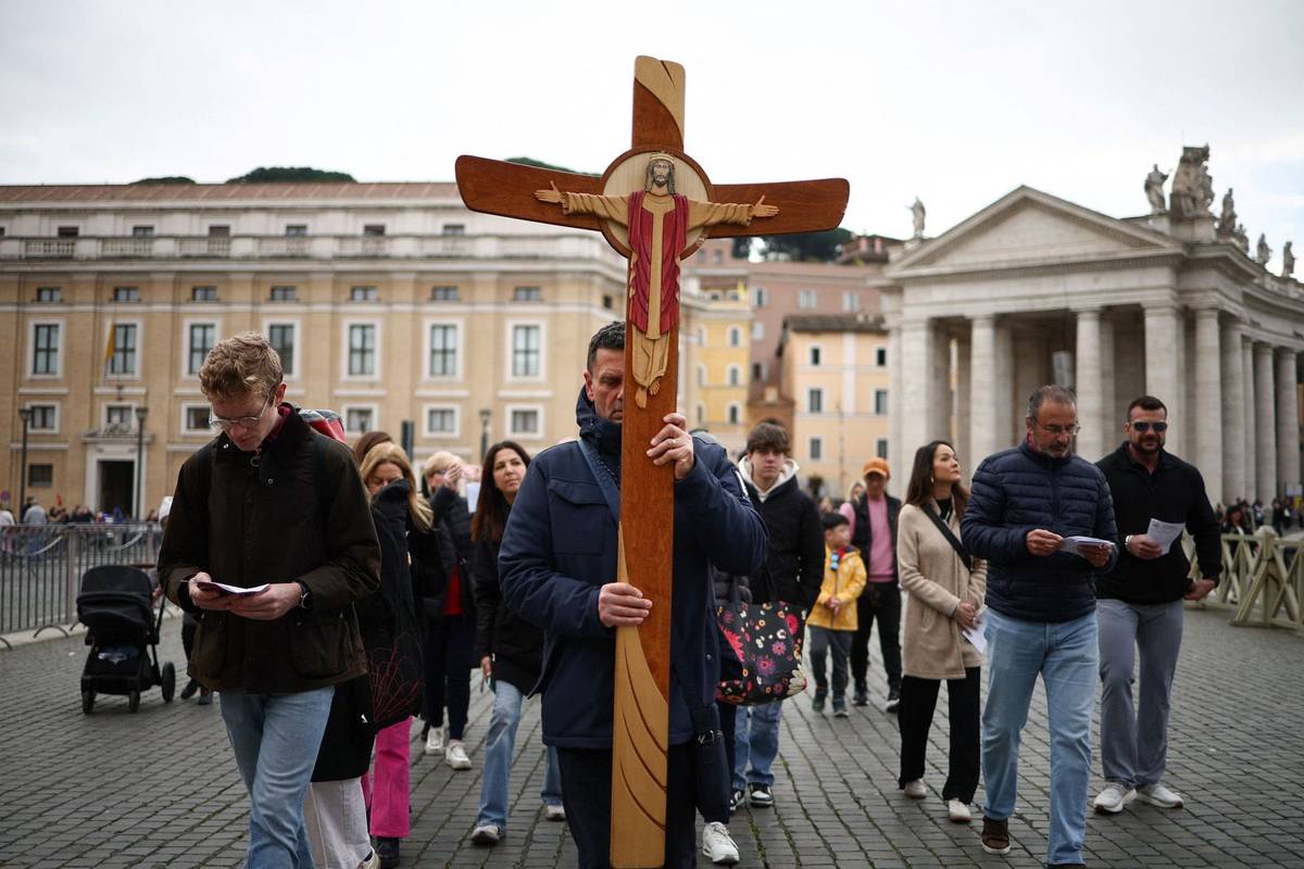 Poutník nese kříž na Svatopetrském náměstí ve Vatikánu, zatímco papež František pokračuje v léčbě infekce dýchacích cest, 18. února 2025.