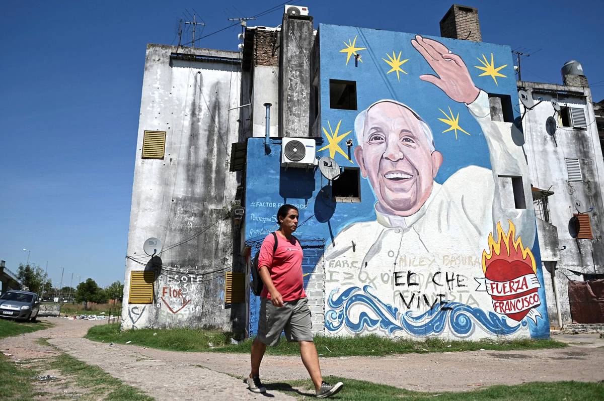 Chodec míjí mural s vyobrazením papeže Františka, zatímco arcidiecéze Buenos Aires vyzývá všechny kostely v Argentině k modlitbám za papežovo zdraví, 19. února 2025.