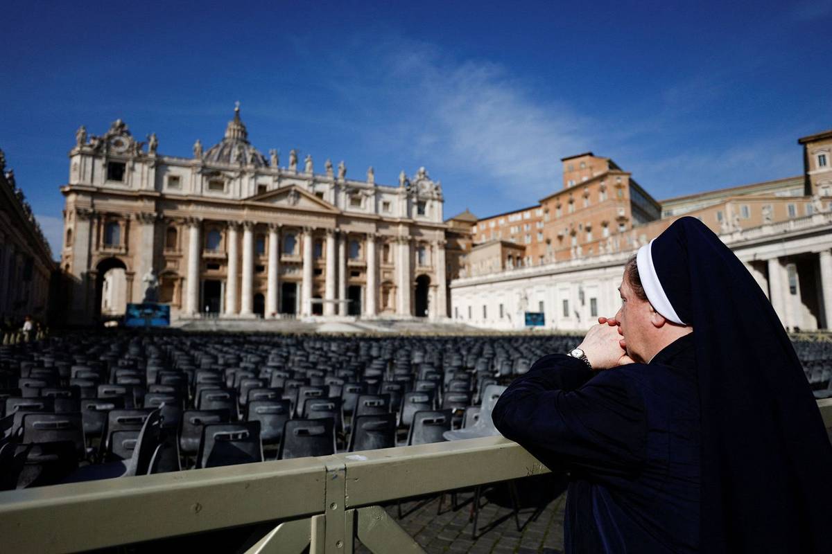 Řeholnice se modlí na Svatopetrském náměstí, zatímco papež František podstupuje léčbu v nemocnici Gemelli a nemůže vést nedělní modlitbu Anděl Páně, 23. února 2025.