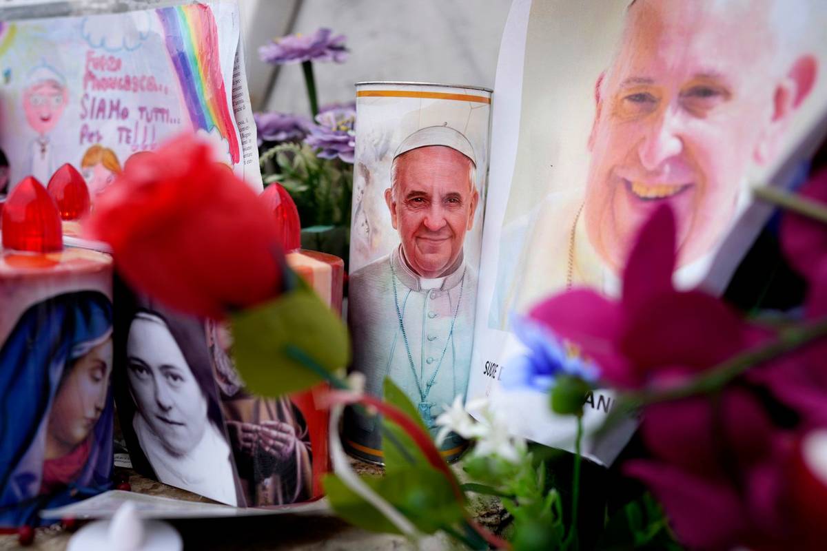 Svíčky a fotografie papeže Františka před nemocnicí Agostino Gemelli v Římě, kde byl hospitalizován od 14. února 2025.