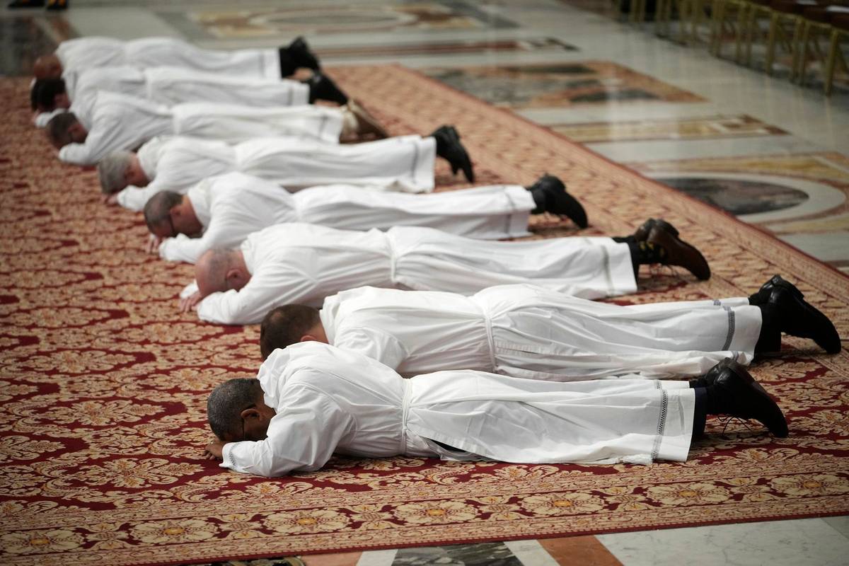 Noví jáhni jsou vysvěceni během mše v rámci Jubilea jáhnů ve Vatikánu, kterou měl původně vést papež František.
