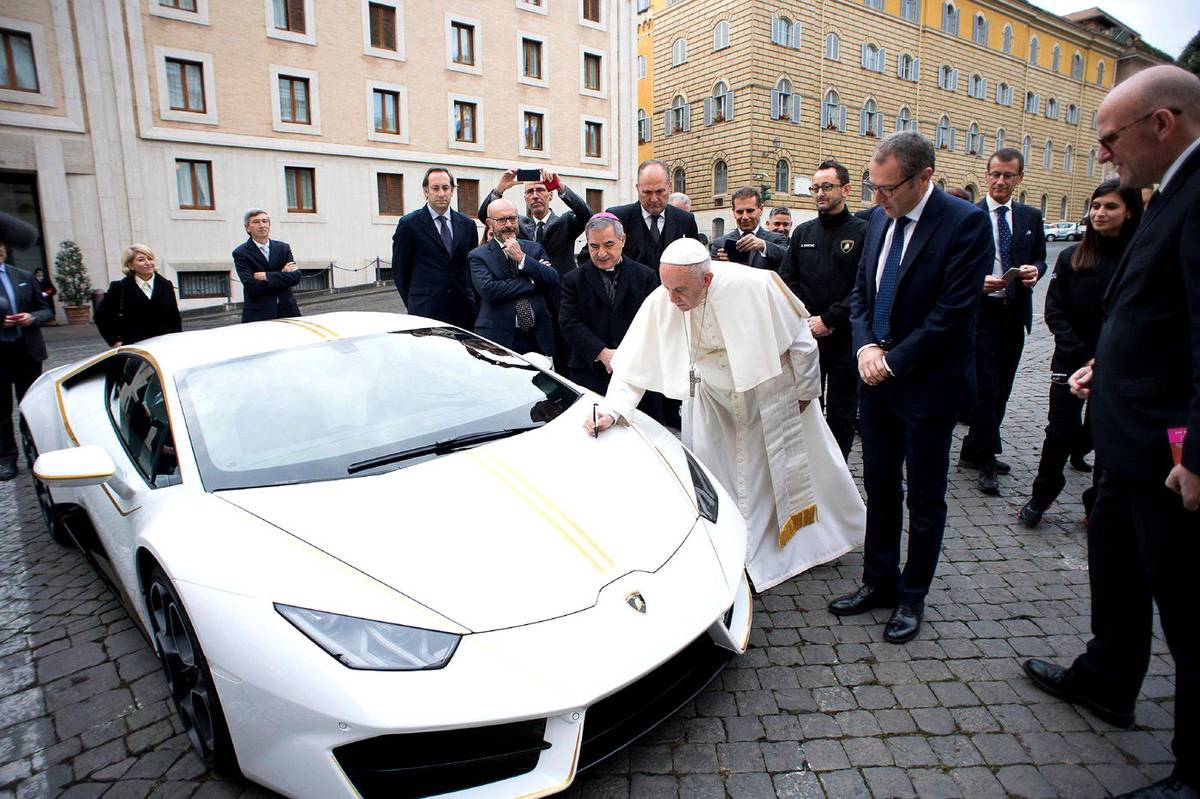 Papež František žehná luxusnímu vozu Lamborghini, který mu věnovala automobilka, 15. listopadu 2017 ve Vatikánu.
