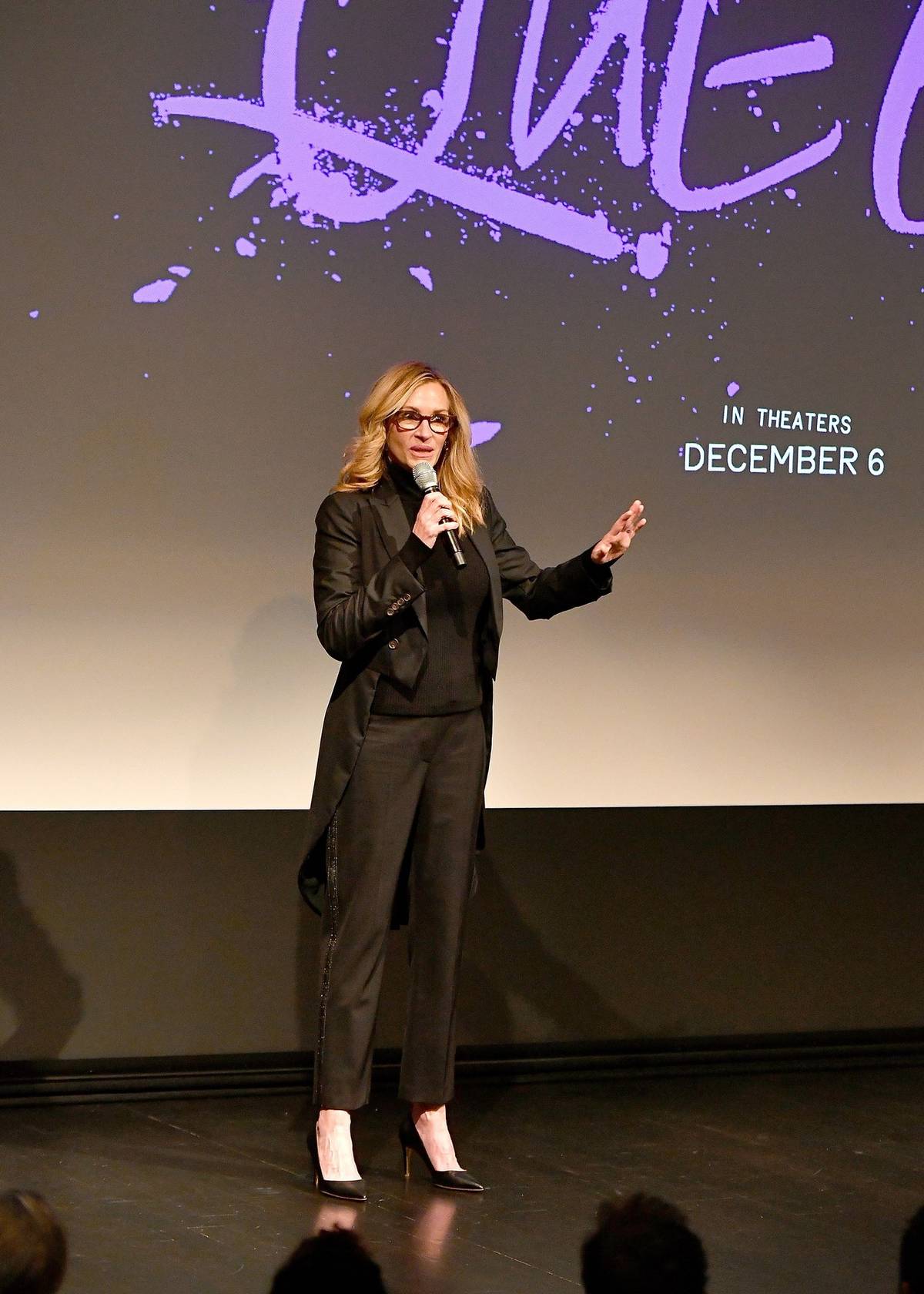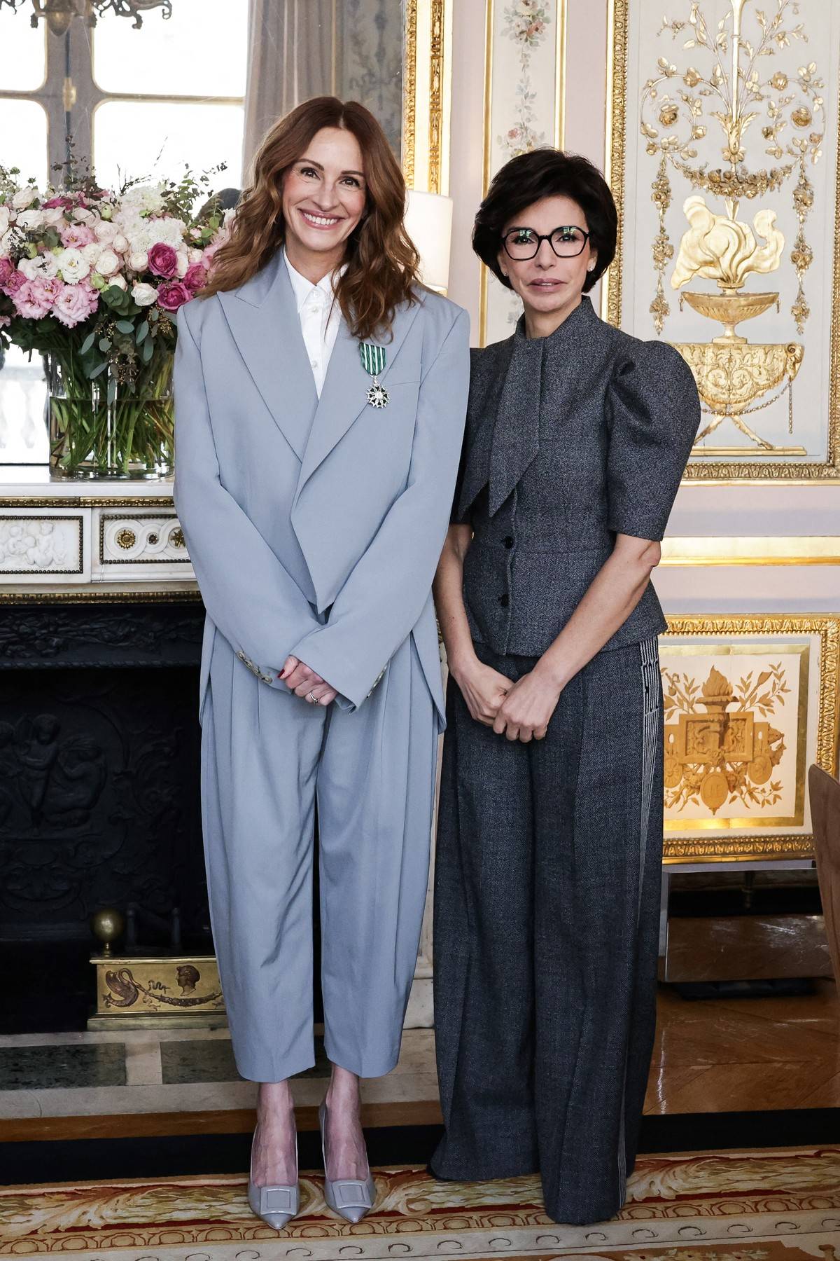 Světle popelavý kostým inspirovaný pánským šatníkem oblékla Julia Robertsová také v Paříži, kde obdržela od ministra kultury cenné vyznamenání za umění a literaturu „Ordre des Arts et des Lettres“.