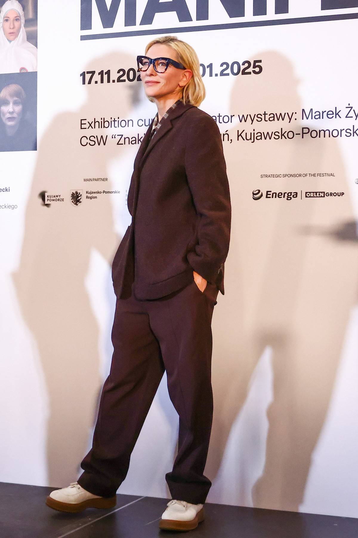 V ležérním pánském obleku a výrazných brýlích otevřela Cate Blanchettová na konci minulého roku výstavu Manifesto v Polsku.