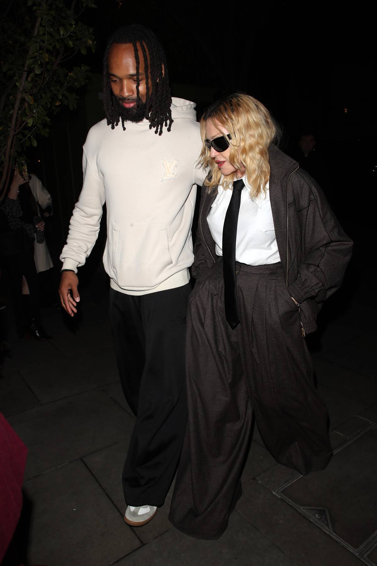 Madonna oblékla široké kalhoty s bombrem a bílou košilí doplněnou úzkou kravatou na rande se svým přítelem Akeemem Morrisem.
