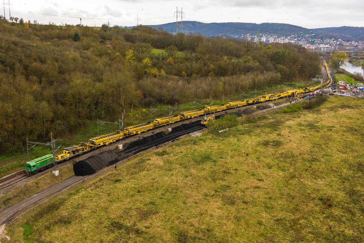 Pohled z výšky na železniční trať kousek za Berounem (na snímku v pozadí). Na trati projíždí sanační stroj AHM 800R, který přes Velikonoce obnovoval železniční svršek a spodní stavbu mezi Karlštejnem a Srbskem. Odtěžuje starý materiál, který skládá na jednotlivé vagony, a zároveň ho nahrazuje materiálem novým.