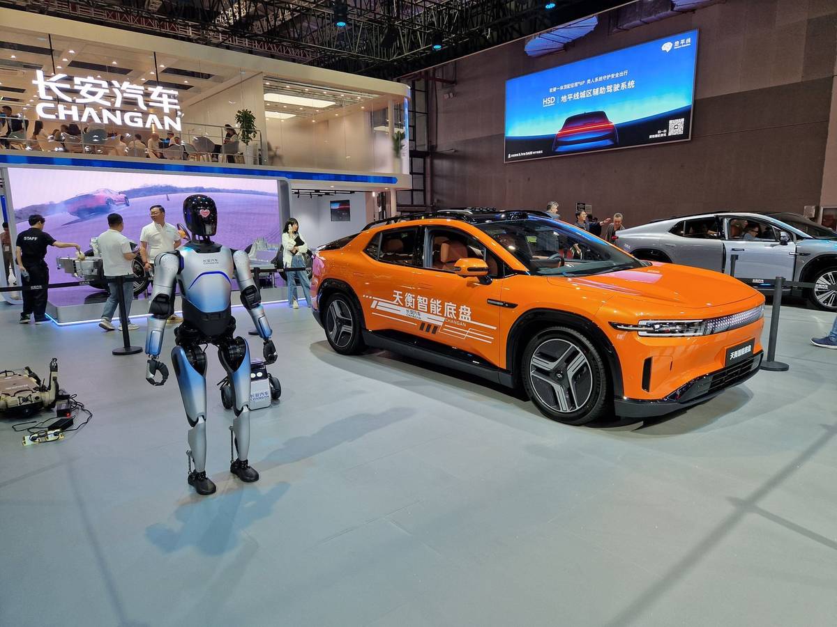 Tématem autosalonu byly i humanoidní roboti. Tady jeden u Deepalu E07, což je elektrický pick-up z dílen koncernu Changan.