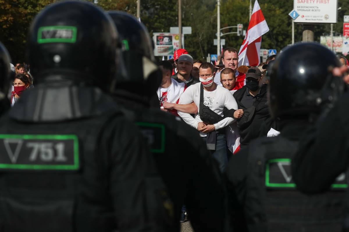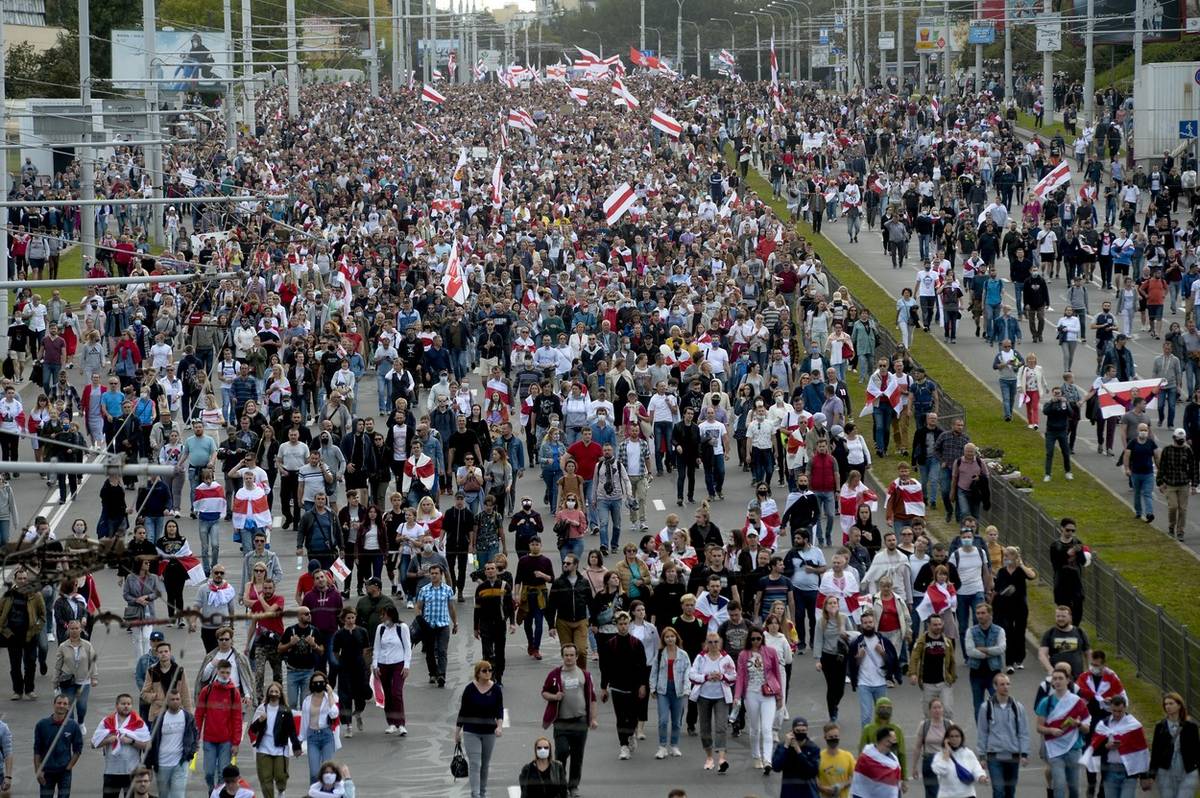 Nedělní demonstrace, která se konala pod heslem "Pochod hrdinů", byla věnována zatčené čelné představitelce opozice Maryji Kalesnikavové a dalším vedoucím osobnostem protestního hnutí, které jsou buď vězněny, nebo je úřady brutálními vyhrůžkami vyhnaly ze země.