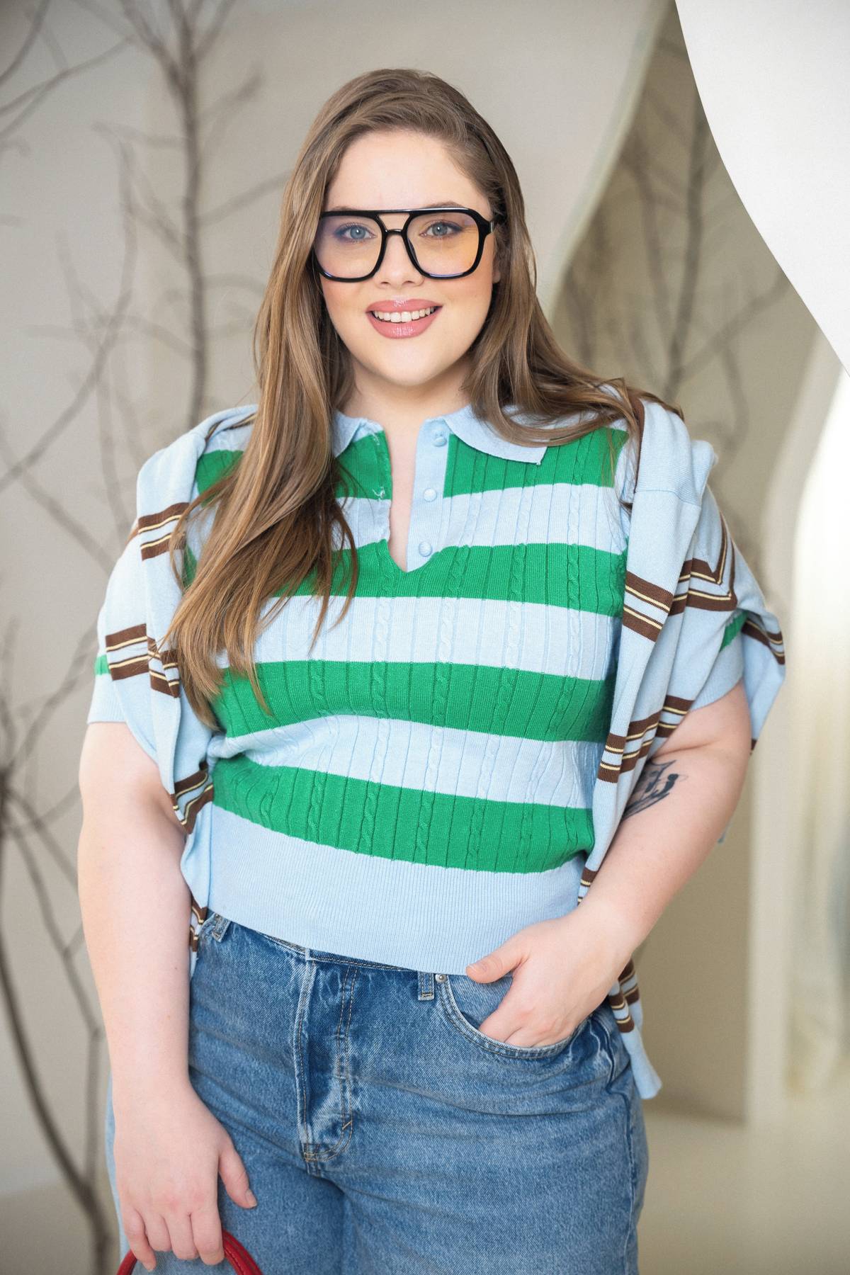 Svetřík Reserved, 699 Kč. Svetr na ramenou Reserved, 759 Kč. Džínové šortky H&M, 599 Kč. Kabelka Marks & Spencer, 1 199 Kč. Přívěsek na kabelce Reserved, 499 Kč. Boty Off-White, prodává Half Price, 6 199 Kč. Brýle proti modrému světlu H&M, 359 Kč