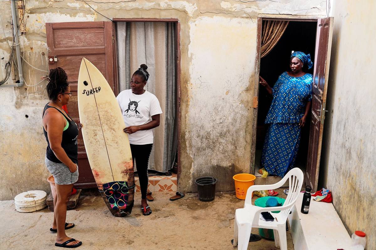 Sambeová drží surf a povídá si se svou trenérkou Rhondou Harperovou, která školu pro ženské surfařky Black Girls Surf založila. Zprava dvojici pozoruje matka Sambeové Koune Ba.