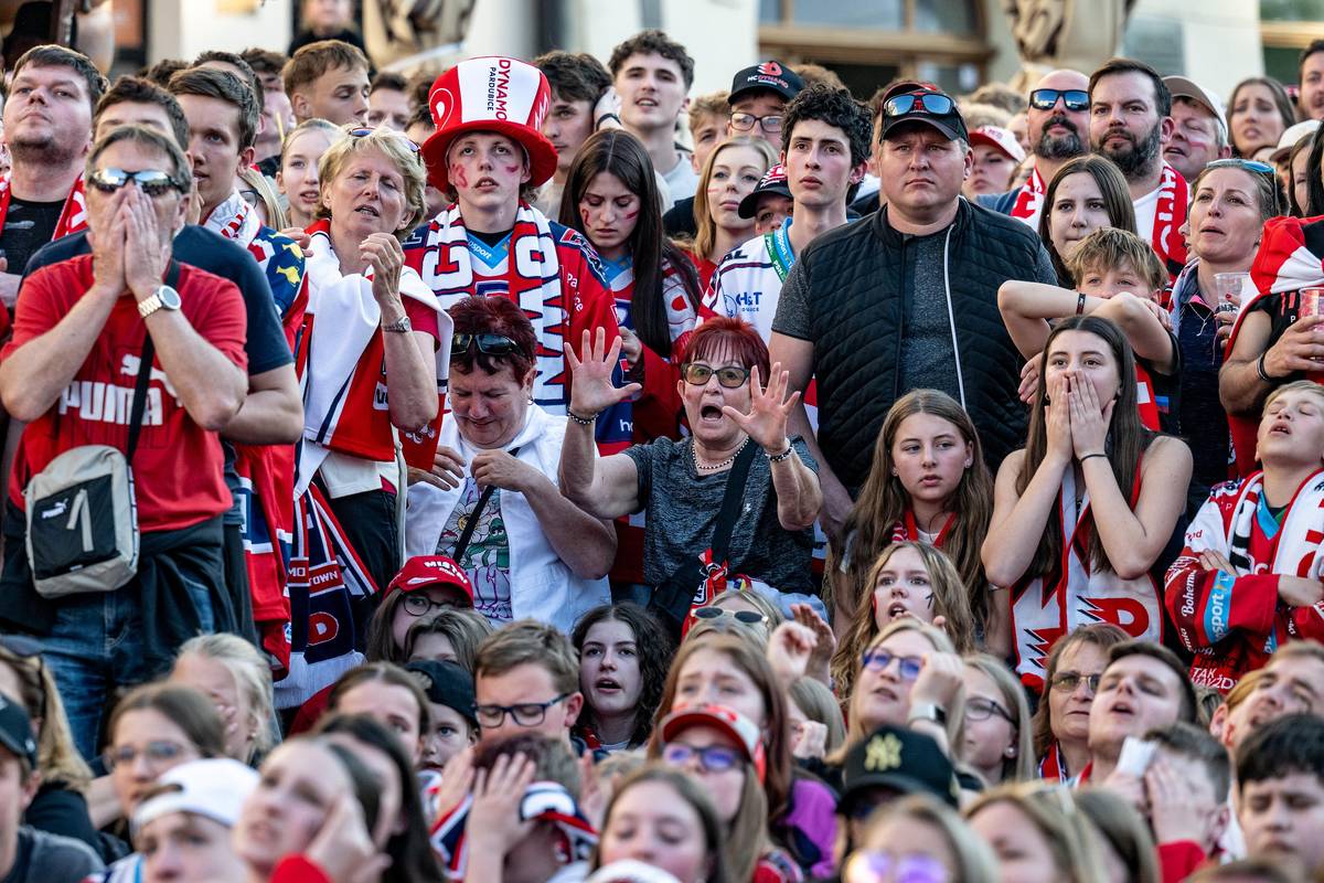 Fanoušci Dynama sledují na velkoplošné obrazovce na Pernštýnském náměstí sedmý zápas finále extraligy.