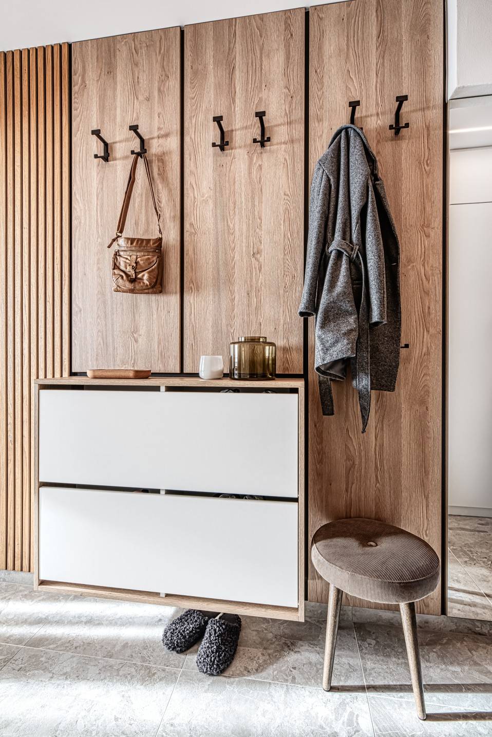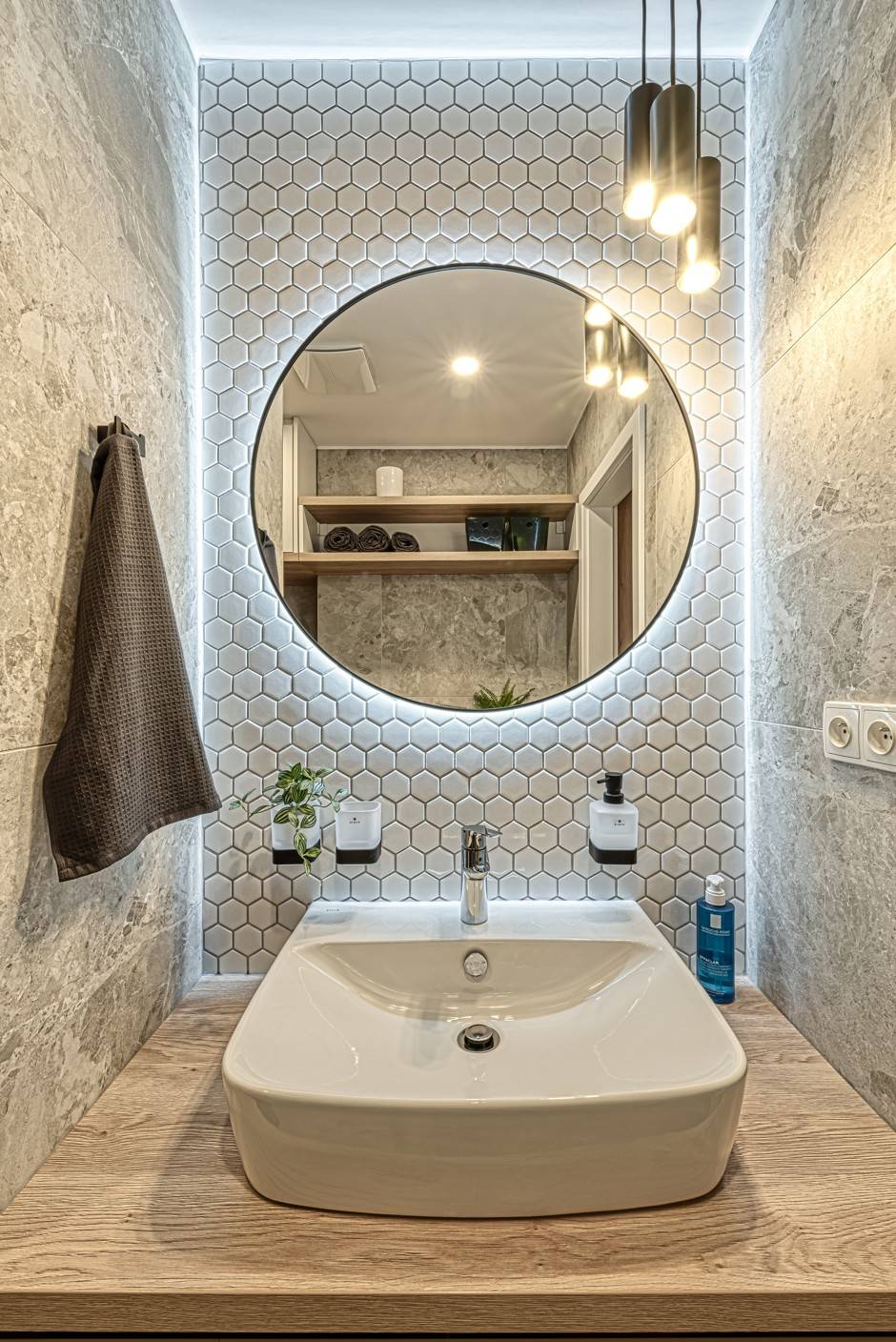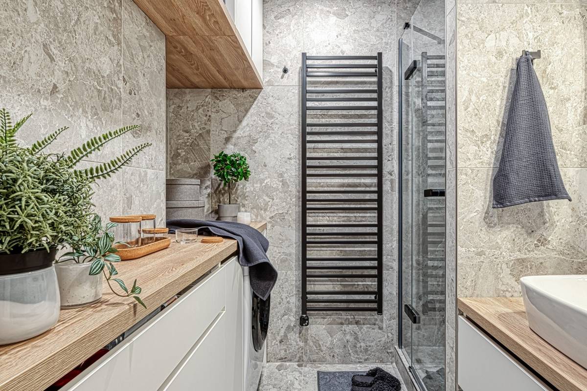 Motiv dřeva, betonu a černé detaily se opakují i zde