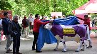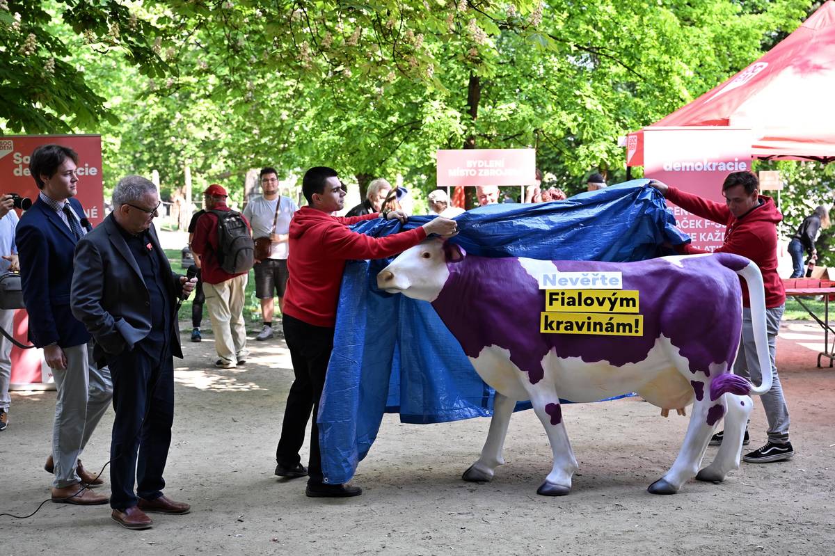 Kandidát SOCDEM Lubomír Zaorálek pozoroval odhalení fialové krávy s heslem: Nevěřte Fialovým kravinám.