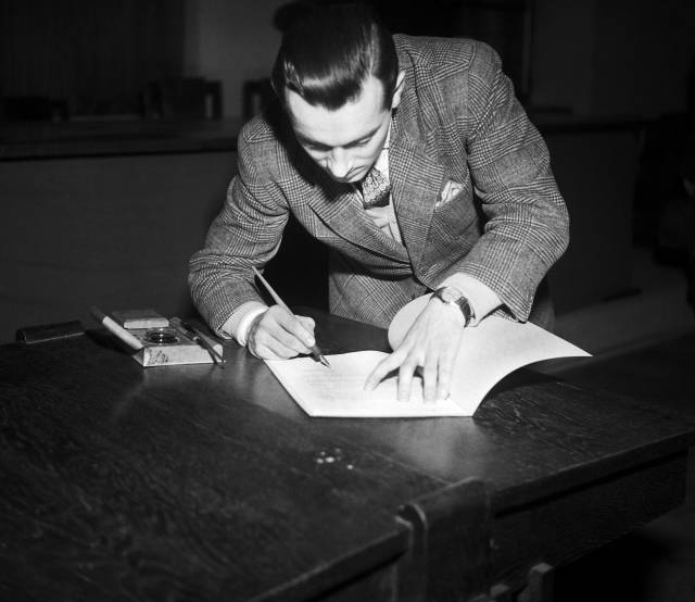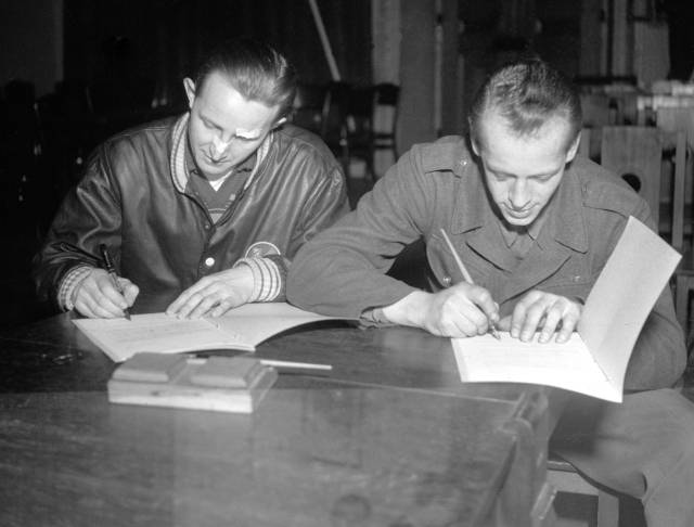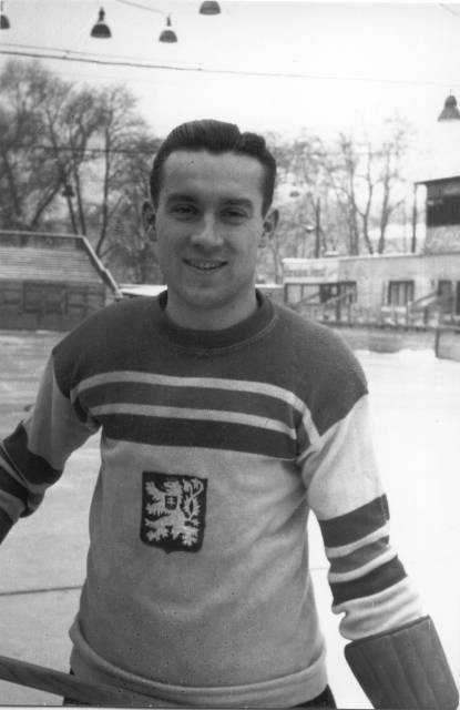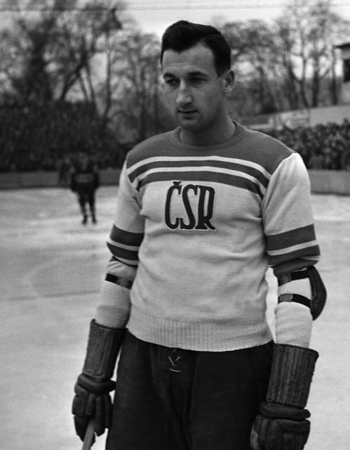Snímek z ledna 1950. Tehdy se hokejisté, vybraní pro přípravu československého národního mužstva pro MS v Londýně, sešli v Tyršově domě, kde složili slib zavazující k poctivé přípravě a řádné životosprávě. Na snímku tento slib podepisuje Stanislav Konopásek (12 let vězení).