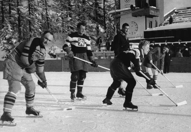 Po únorovém komunistickém puči začali z Československa emigrovat úspěšní sportovci, jakými byli třeba tenista Jaroslav Drobný nebo krasobruslařka Ája Vrzáňová, a zástupci režimu propadli panice, aby v Anglii nezůstala i zlatá hokejová skupina. (Na snímku Bóža Modrý při tréninku ve Svatém Mořici,rok 1948.)