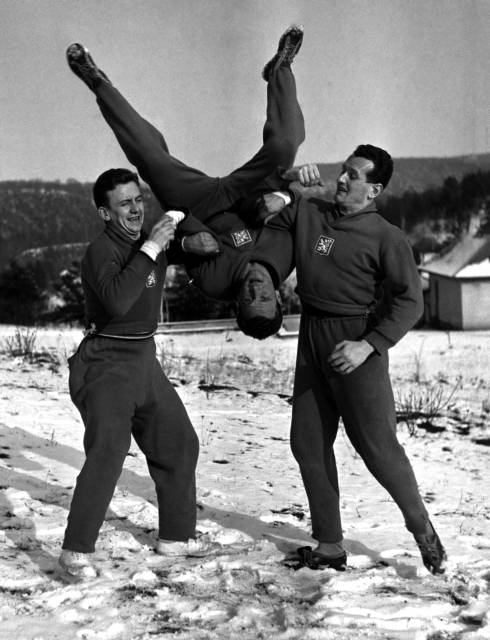 Momentka z příprav na MS v Londýně, soustřední probíhalo na Hřebenkách u Kladna. Na snímku pomáhají Augustin Bubník (vlevo) a Přemysl Hainý (vpravo) Vladimíru Kobranovi (uprostřed) s přemetem. V komunistických lágrech ztratili nejlepší roky svého sportovního života. Když o pět let později udělil prezident Antonín Zápotocký těm nejpřísněji potrestaným milost, pro mnohé bylo pozdě. Bóža Modrý se z uranových dolů vrátil s podlomeným zdravím, zemřel v roce 1963.