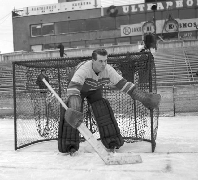 Policisté pak vyprovokovali strkanici a hokejisty začali zatýkat. Posléze byli sportovci obviněni z protistátní činnosti, velezrady a špionáže. Za hlavu spiknutí byl označený právě nesmírně talentovaný a populární brankář mužstva Bohumil Bóža Modrý (na snímku během tréninku, rok 1947).