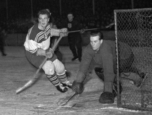 Hokejisté se chystali do Londýna na obhajobu titulu. Ale nikdy na šampionát neodletěli. (Na snímku Augustin Bubník v akci, Zimní stadion Praha 1950.)