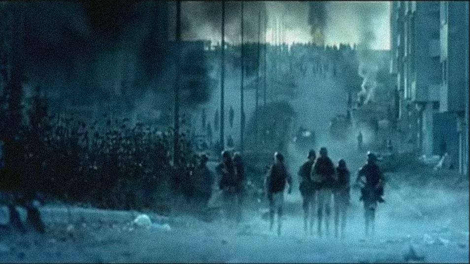 Snímek z autentických záběrů z operace v Mogadišu z 3. října 1993. Američtí vojáci bojují o přežití v pouličních bojích.