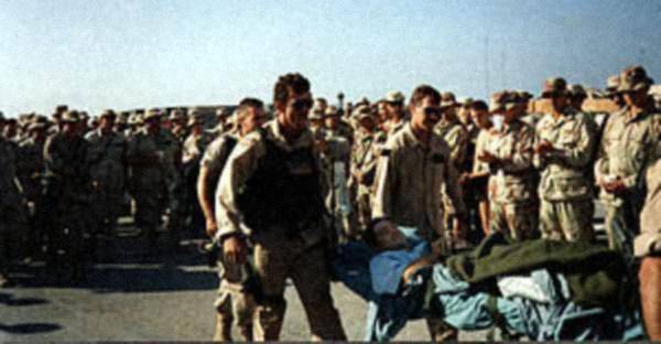 Zachránění američtí vojáci se shromažďovali na stadionu, který osadily pákistánské jednotky OSN. Mrtvých bylo 19, zraněných osm desítek. Autentický snímek, 4. října 1993.