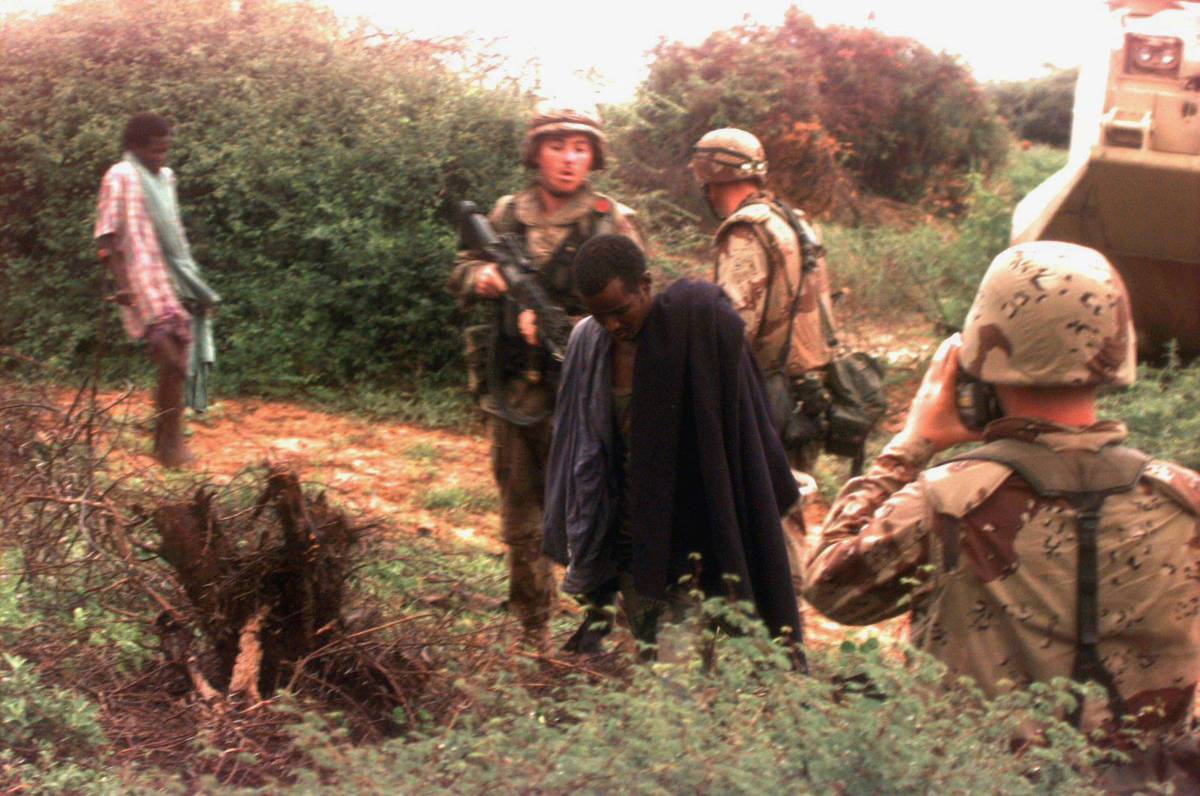 Somálští bojovníci na snímku se vzdávají americkým vojákům.