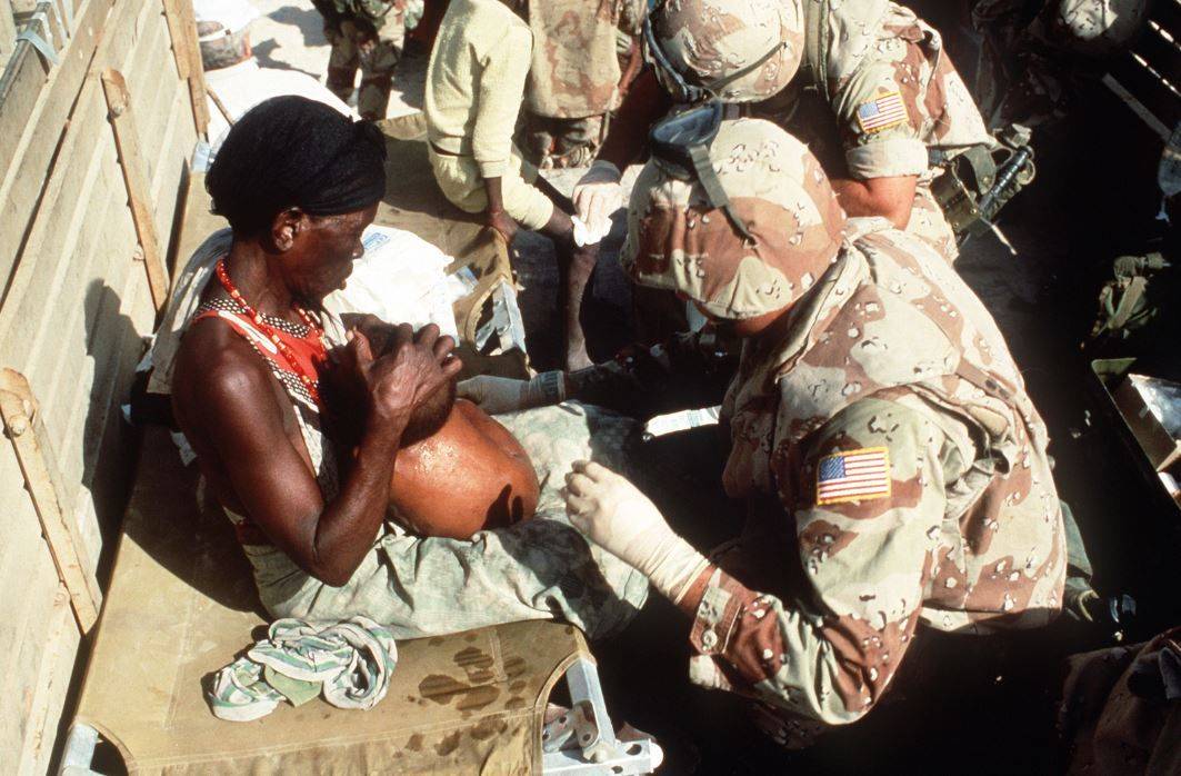 Příslušník americké námořní pěchoty poskytuje zdravotnickou pomoc místním. I přes veškerou snahu nesli někteří Somálci přítomnost Američanů nelibě.