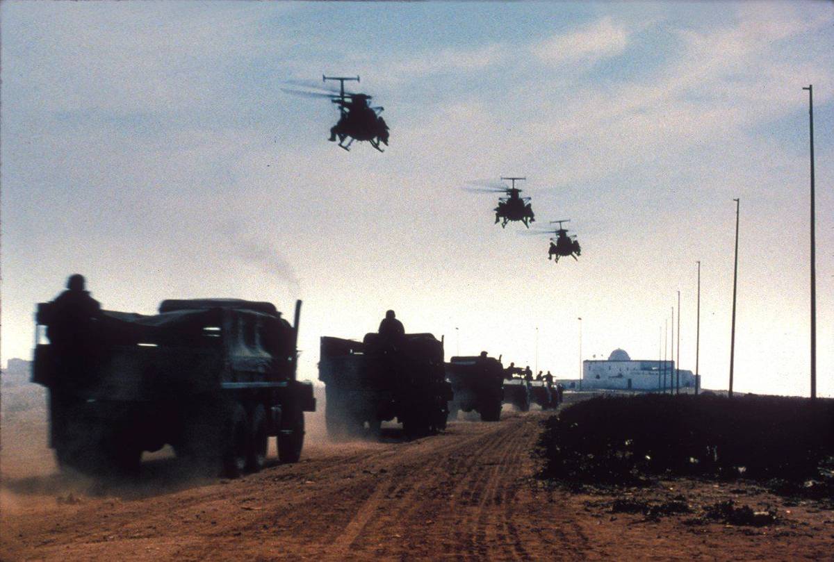 3. října 1993, den akce, den bitvy o Mogadišo. Do hlavního somálského města míří americký konvoj a nechybí ani helikoptéry. Záběr pochází ze slavného filmu amerického režiséra Ridleyho Scotta Černý jestřáb sestřelen.