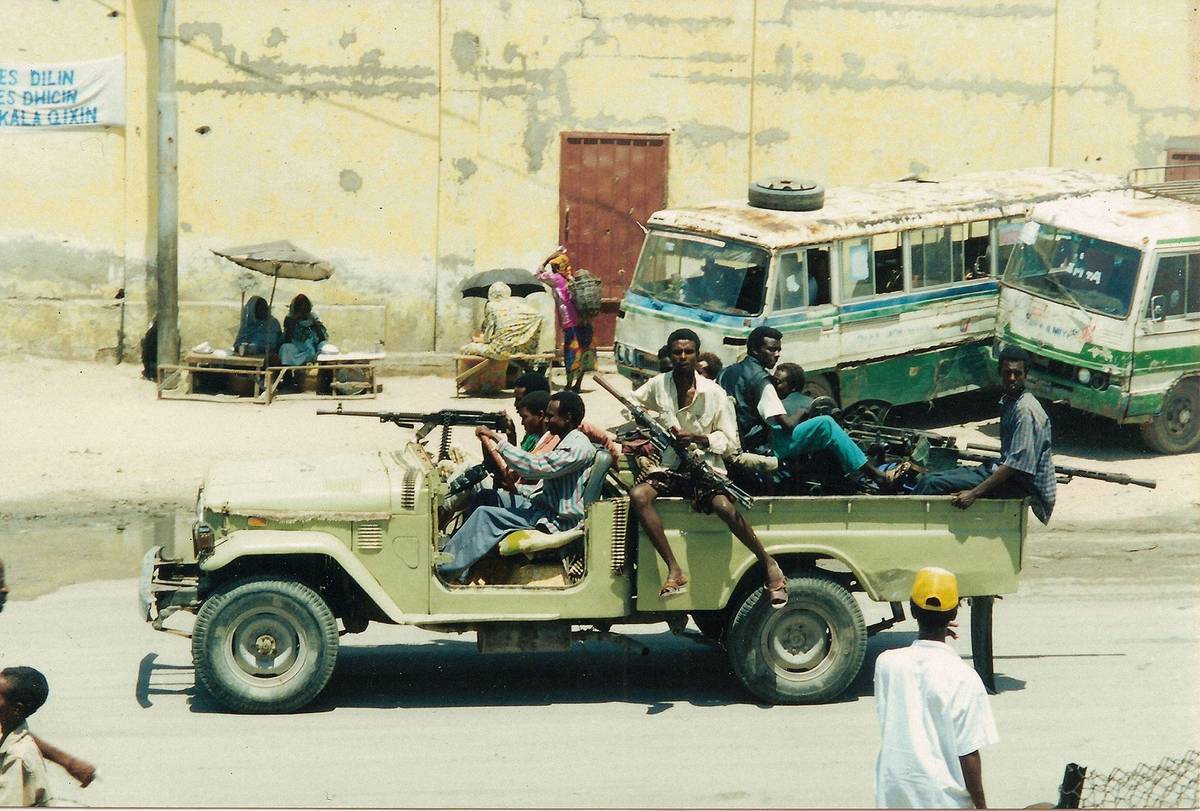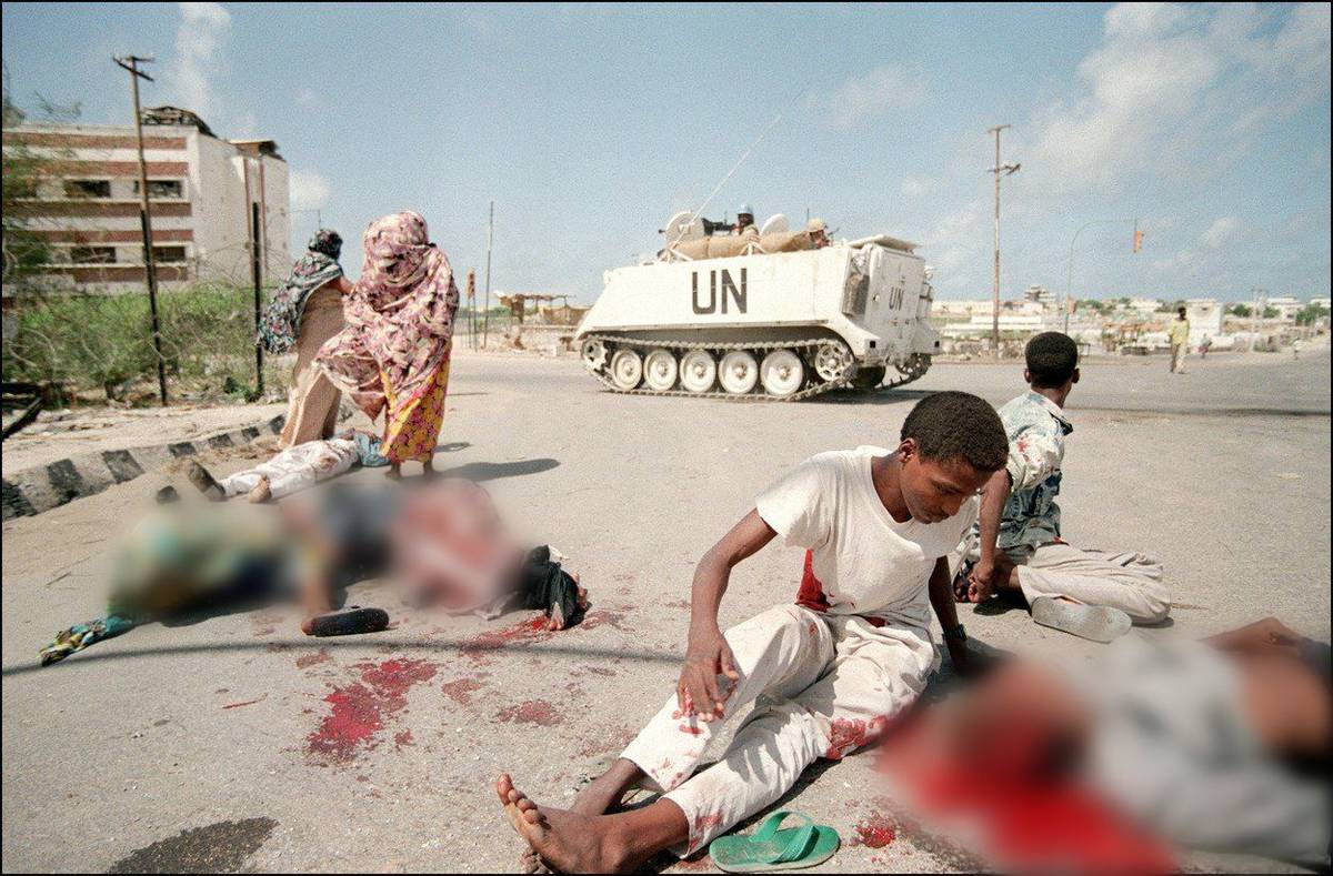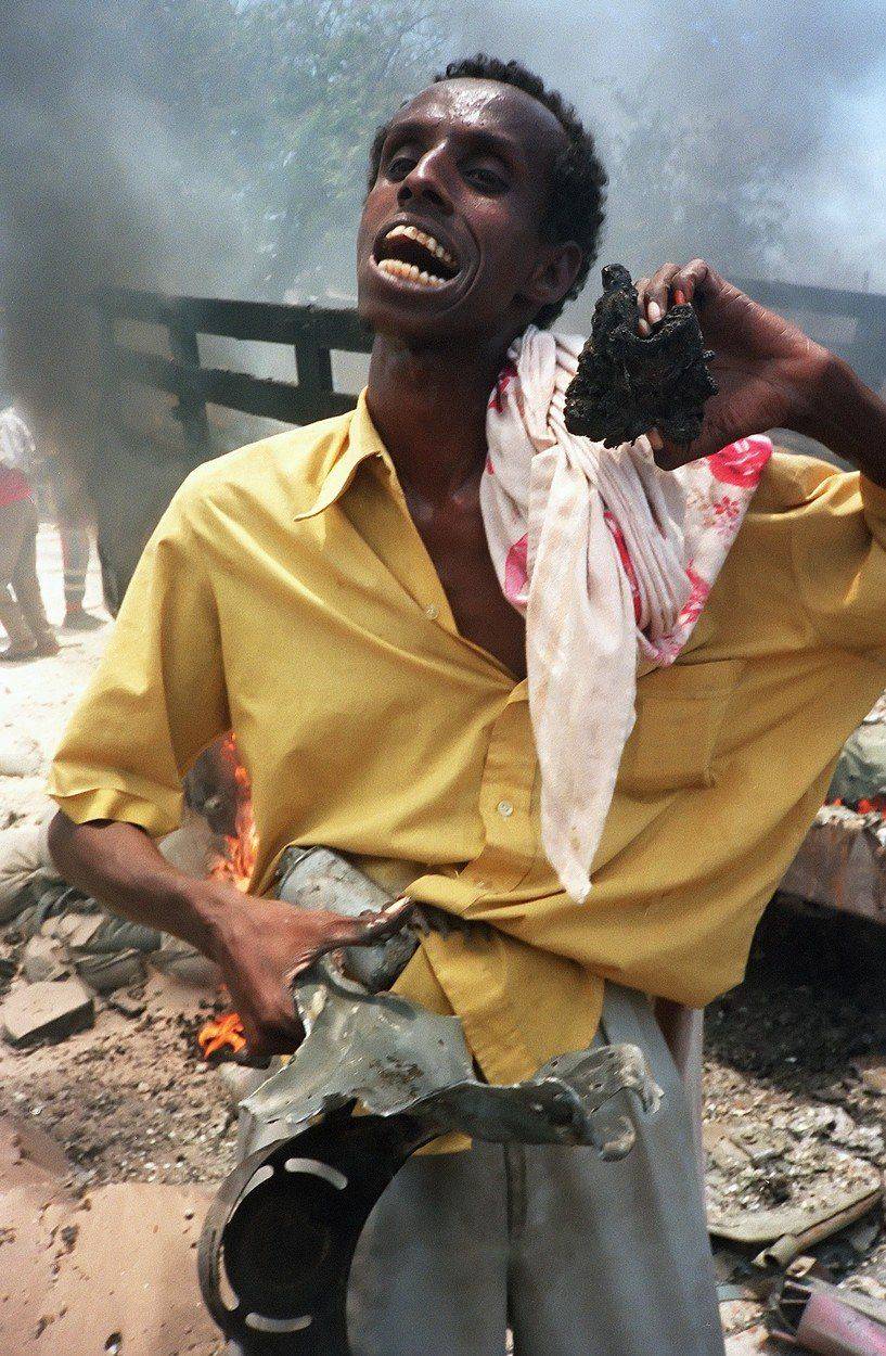 Ulice Mogadiša byly během občanské války nebezpečné nejen pro místní, ale i pro zahraniční novináře. Zabit byl i autor snímku, teprve 22letý fotograf Dan Eldon, do té doby nejmladší zpravodaj agentury Reuters. Podle některých verzí šlo o pomstu za neúspěšný americký útok na Aidida.