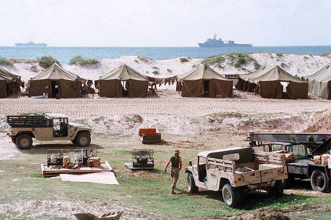 Somálsko tehdy bylo na kolenou, rozdrobené na řadu menších i větších oblastí podléhajících jednotlivým klanovým milicím. Generál Aidid velel klanu Habar Gedid a v jednu dobu kontroloval asi čtvrtinu státu včetně hlavního města Mogadiša. Na snímku americký vojenský tábor vztyčený na hlavním mogadišském letišti.