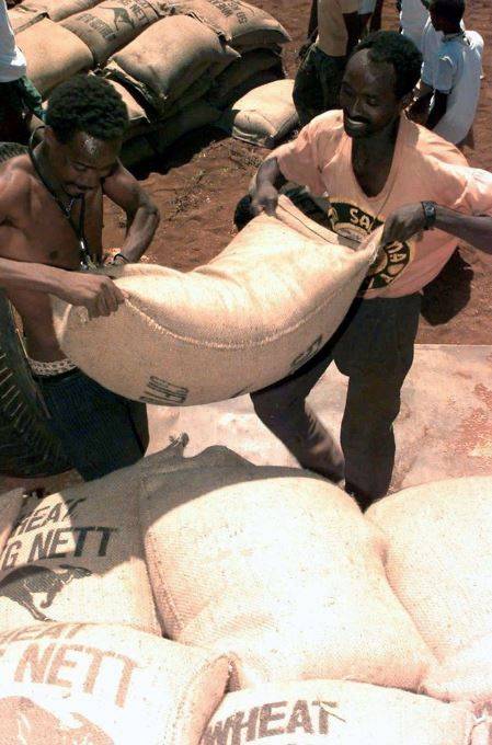 Řada Somálců byla závislá na humanitární pomoci. Země si v letech 1991 a 1992 prošla hladomorem, při kterém podle odhadů zemřelo na čtvrt milionu lidí. Některé statistiky hovoří o mnohem vyšších číslech. Na snímku pšenice, kterou dodala Austrálie. Její rozdělování pomáhali koordinovat i američtí mariňáci.