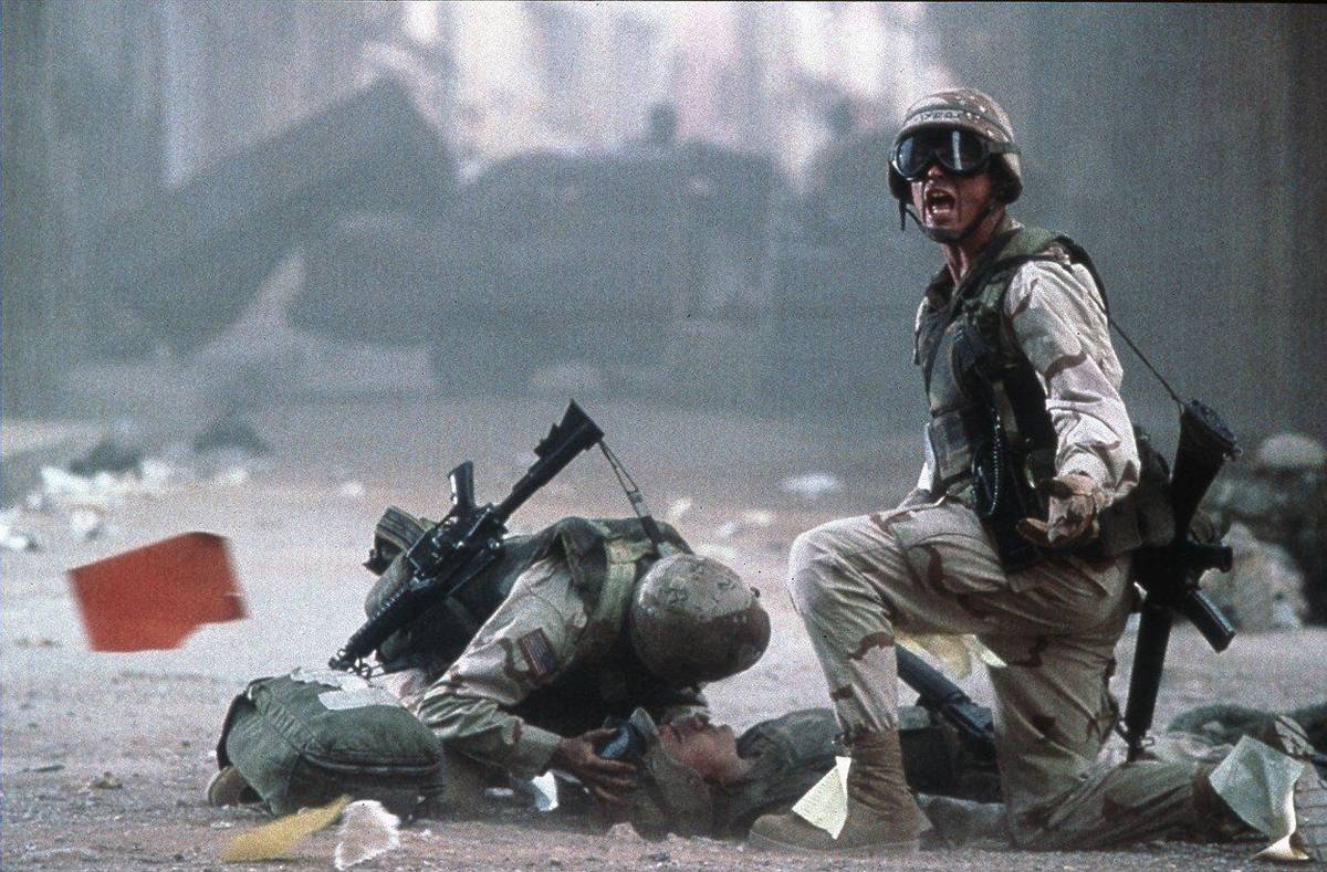 Američtí vojáci se v ulicích Mogadiša potýkali s řadou komplikací. Nakonec museli obklíčeni zůstat i po setmění a bránit se přesile. Ze vzduchu jim pomáhaly bojové helikoptéry. Ilustrační snímek z filmu Černý jestřáb sestřelen.