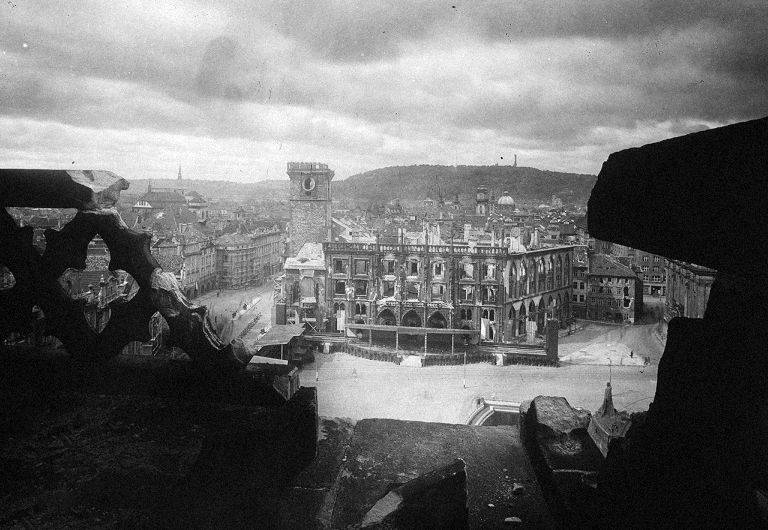 Tragédie z konce války. Staroměstská radnice vyhořela během bojů Pražského povstání (květen 1945).