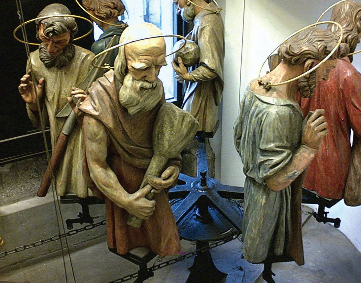 Průvod apoštolů (levý okruh), v popředí sv. Jakub nesoucí kyj