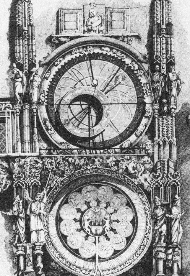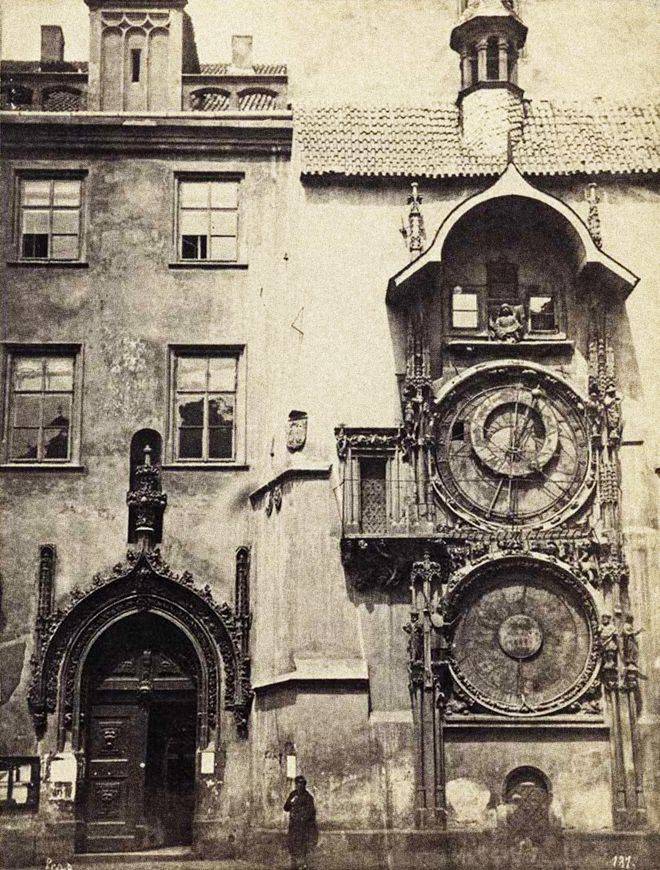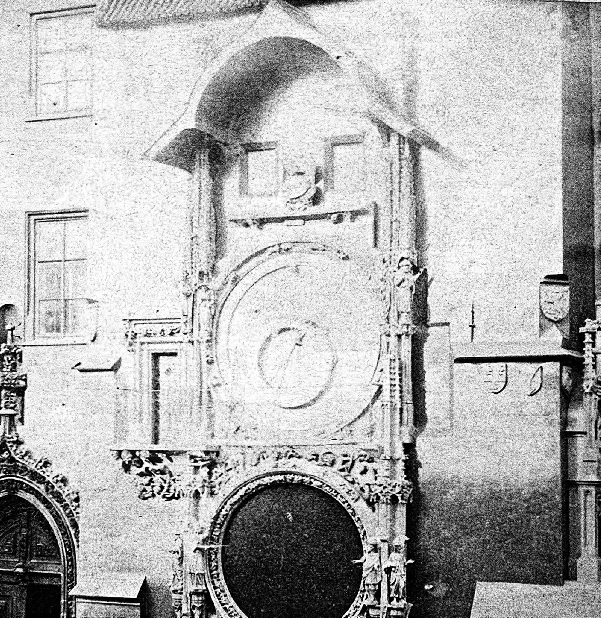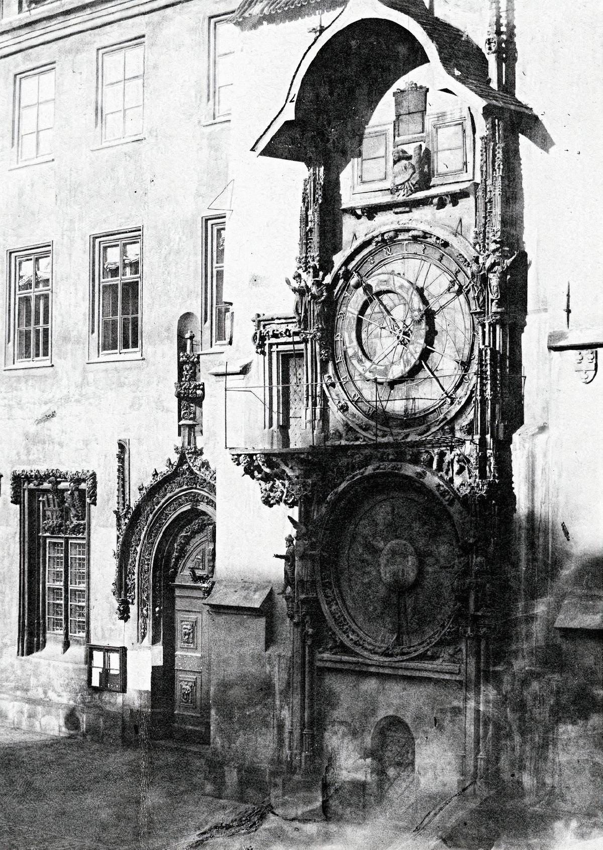 Orloj po rekonstrukci stroje a astronomického ciferníku, ale ještě před osazením Mánesova kalendária. K tomu došlo se zpožděním, v srpnu 1866. Nad okénky ještě není kohout, ten přibyl až v roce 1882 (Fr. Fridrich, 1866).