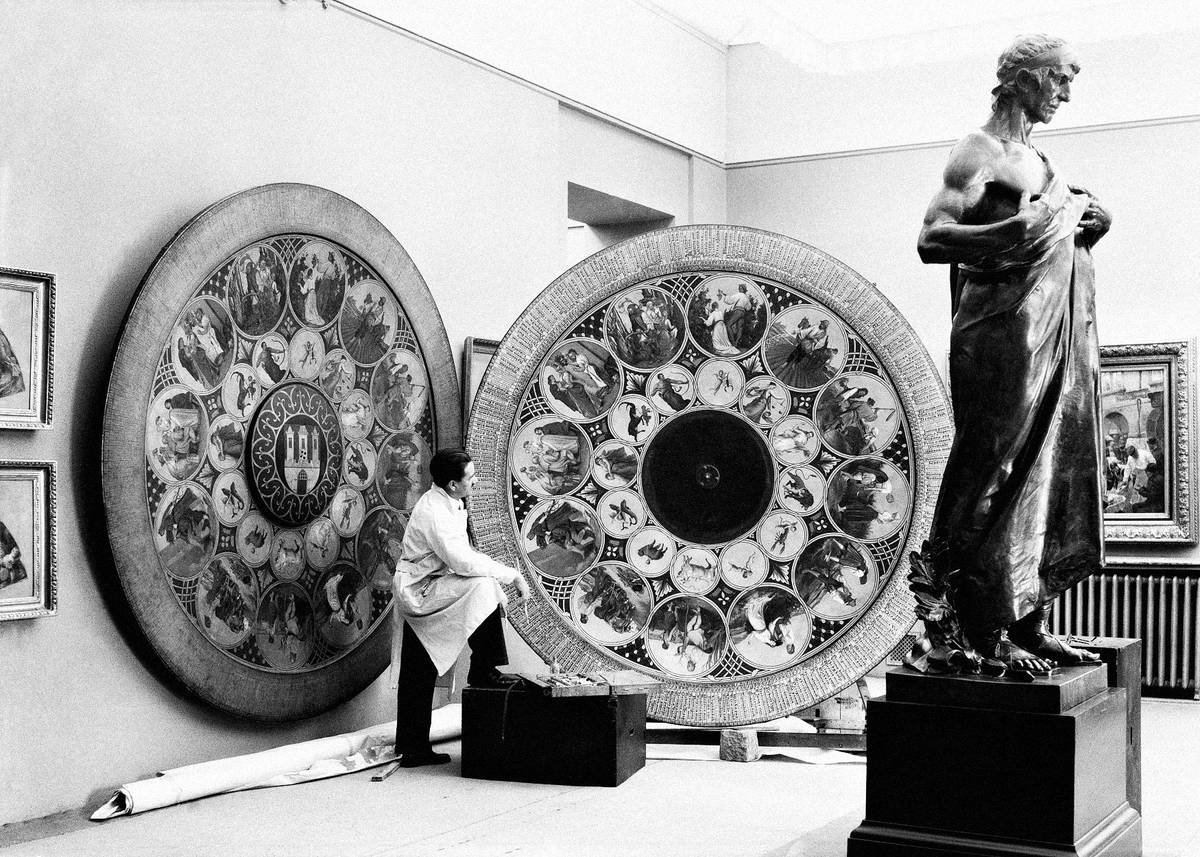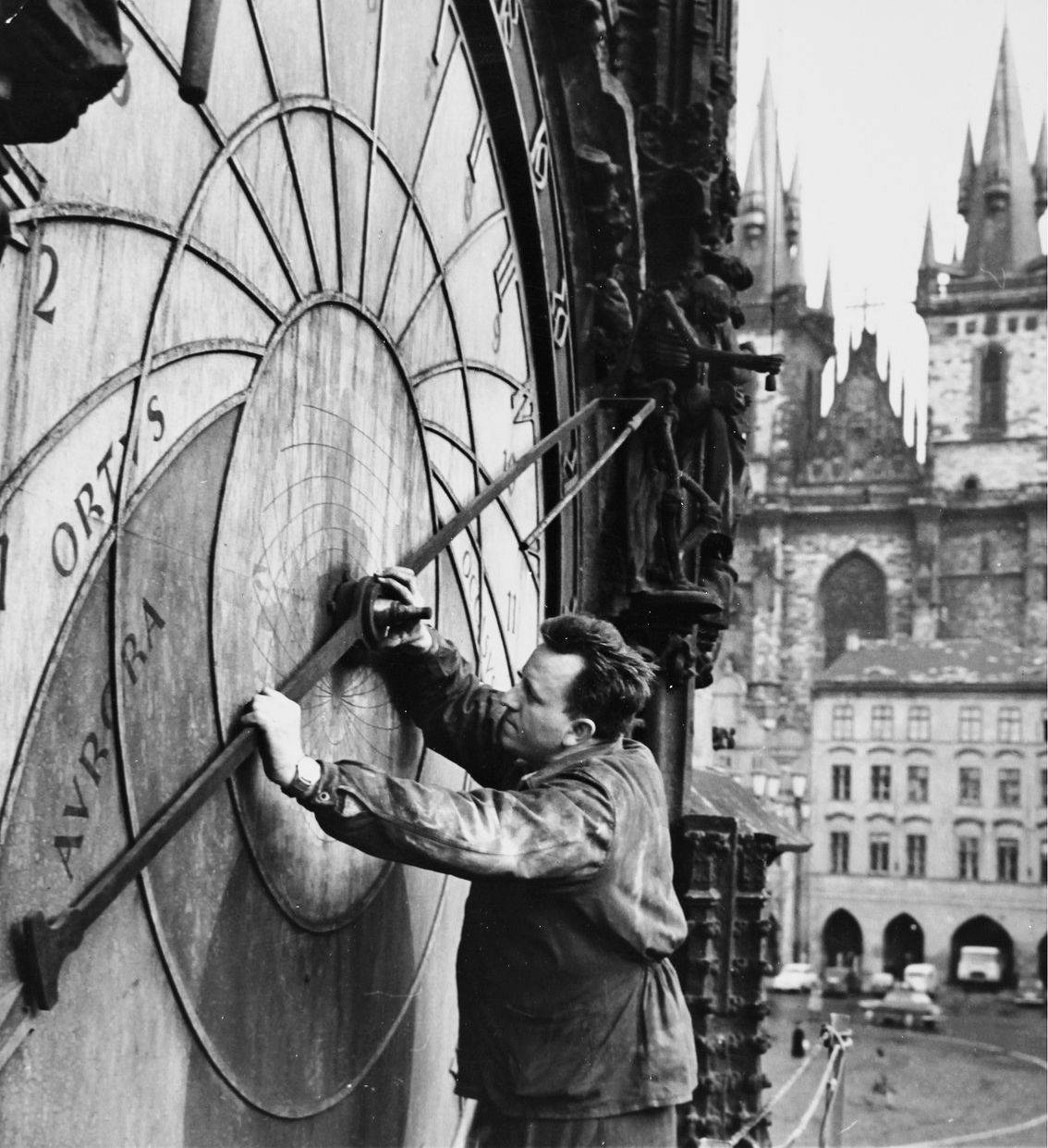 Akademický malíř Bohumír Číla opravuje terč orloje Staroměstské radnice podle původního originálu (vlevo na zdi) Josefa Mánese (červenec 1936).